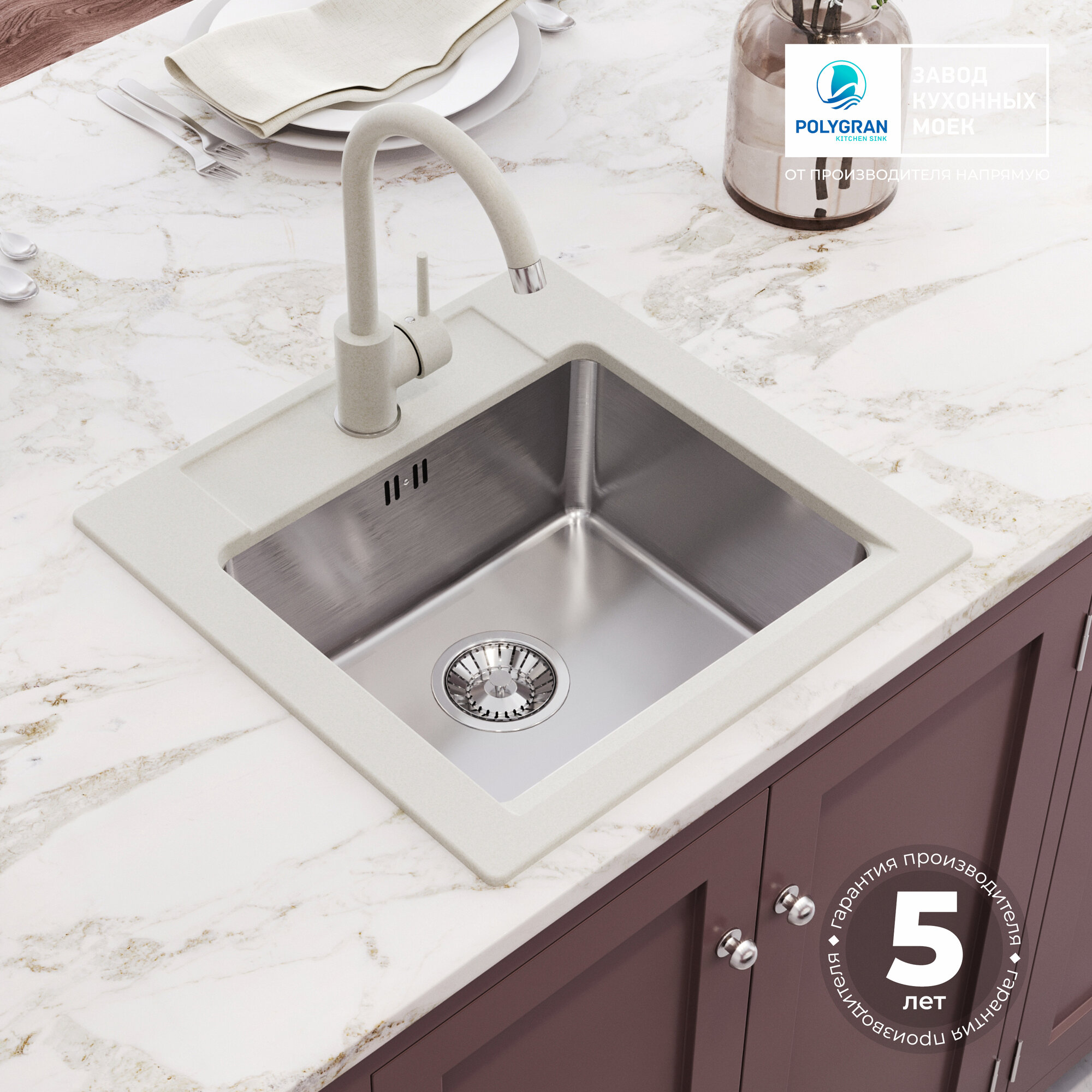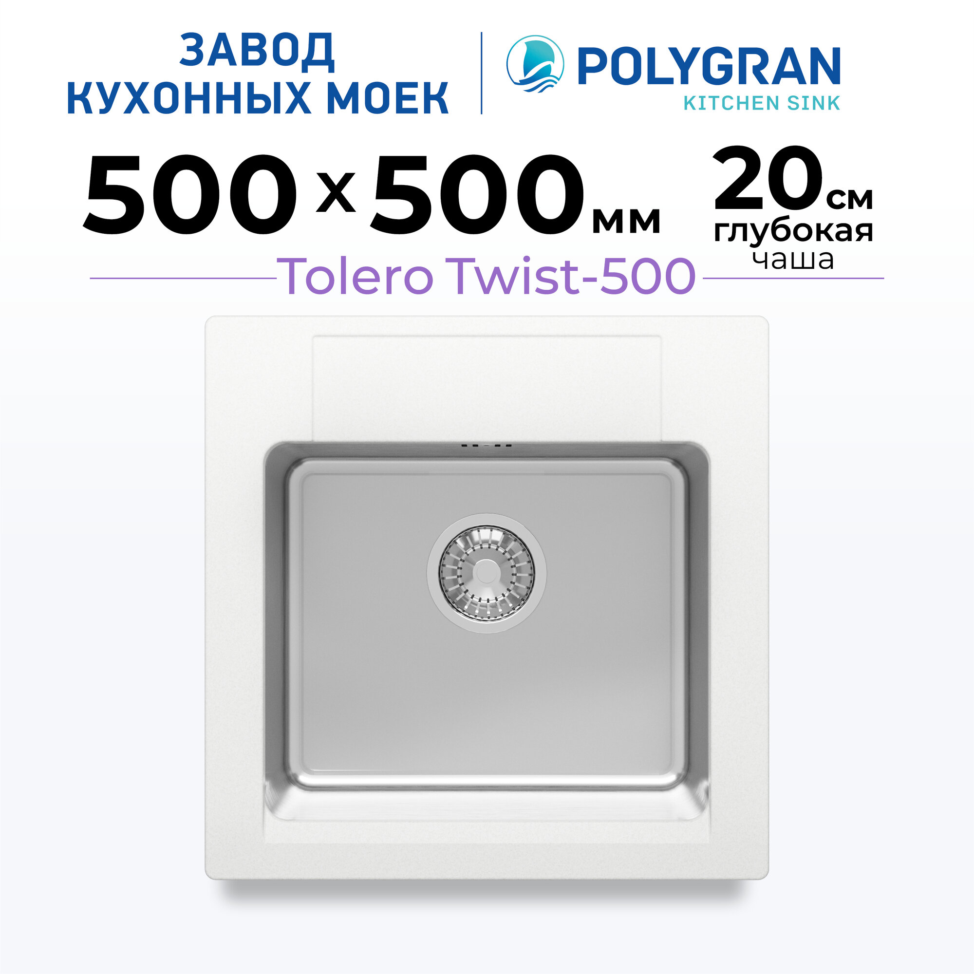Мойка для кухни TOLERO Loft TL-580 дизайнерская, квадратная с запатентованной системой перелива, из кварцевого песка (Германия)(№923 Белый)