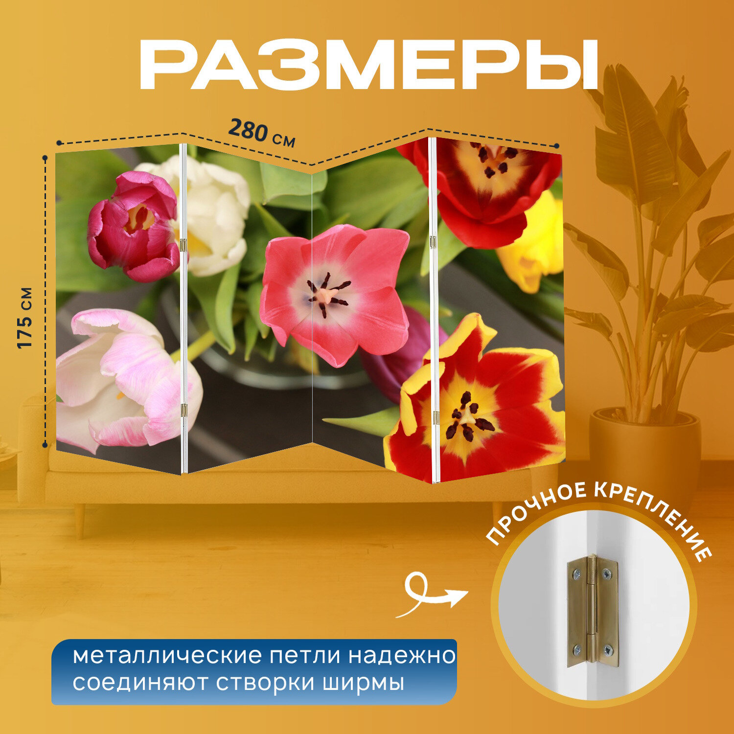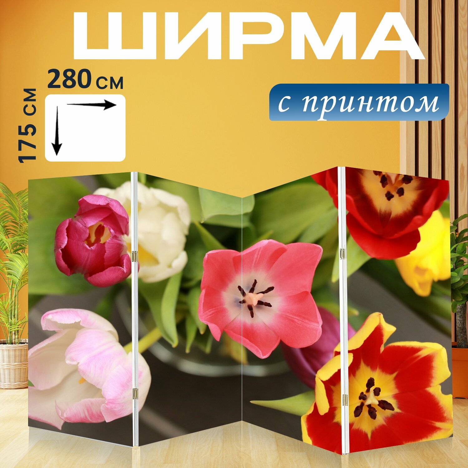 Ширма "Тюльпан, тюльпаны, цветы" перегородка для зонирования комнаты с принтом 280x175 см. на холсте интересное: