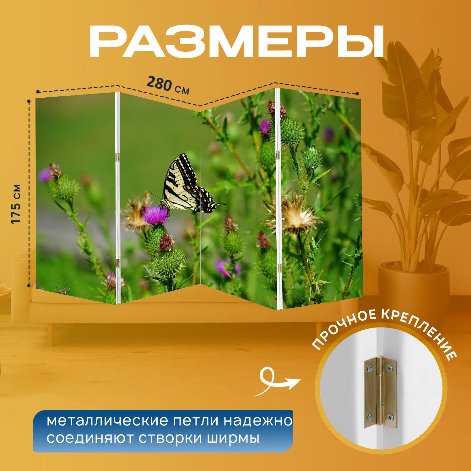 Ширма "Бабочка, крылья, насекомое" перегородка для зонирования комнаты с принтом 280x175 см. на холсте интересное: