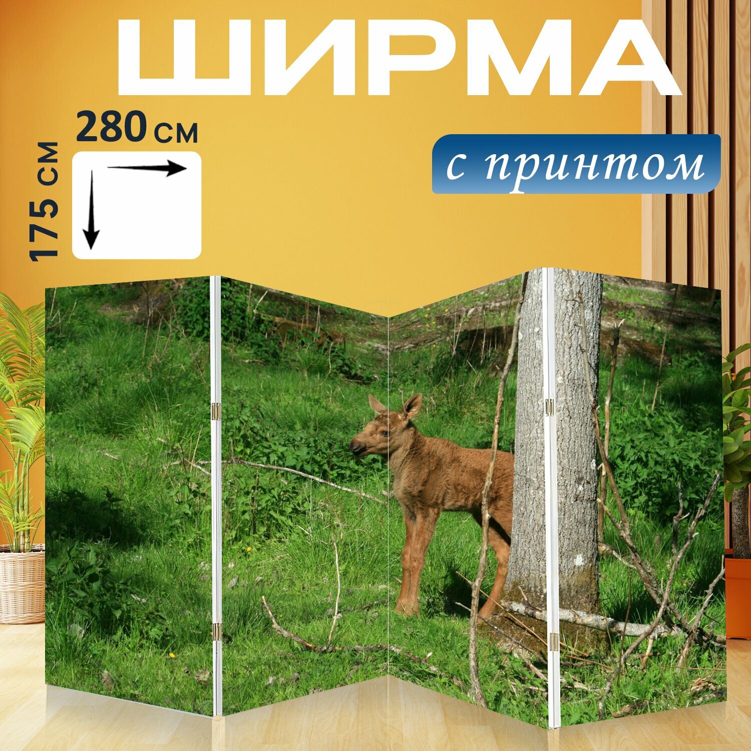 Ширма "Лось теленок, швеция, детеныш" перегородка для зонирования комнаты с принтом 280x175 см. на холсте интересное: