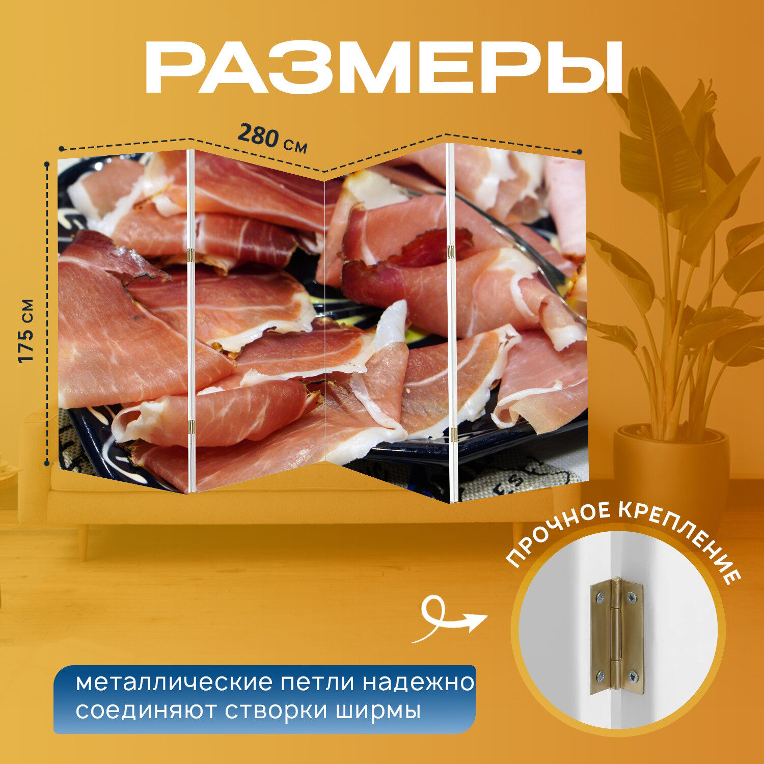 Ширма "Ветчина, мясо, еда" перегородка для зонирования комнаты с принтом 280x175 см. на холсте интересное: