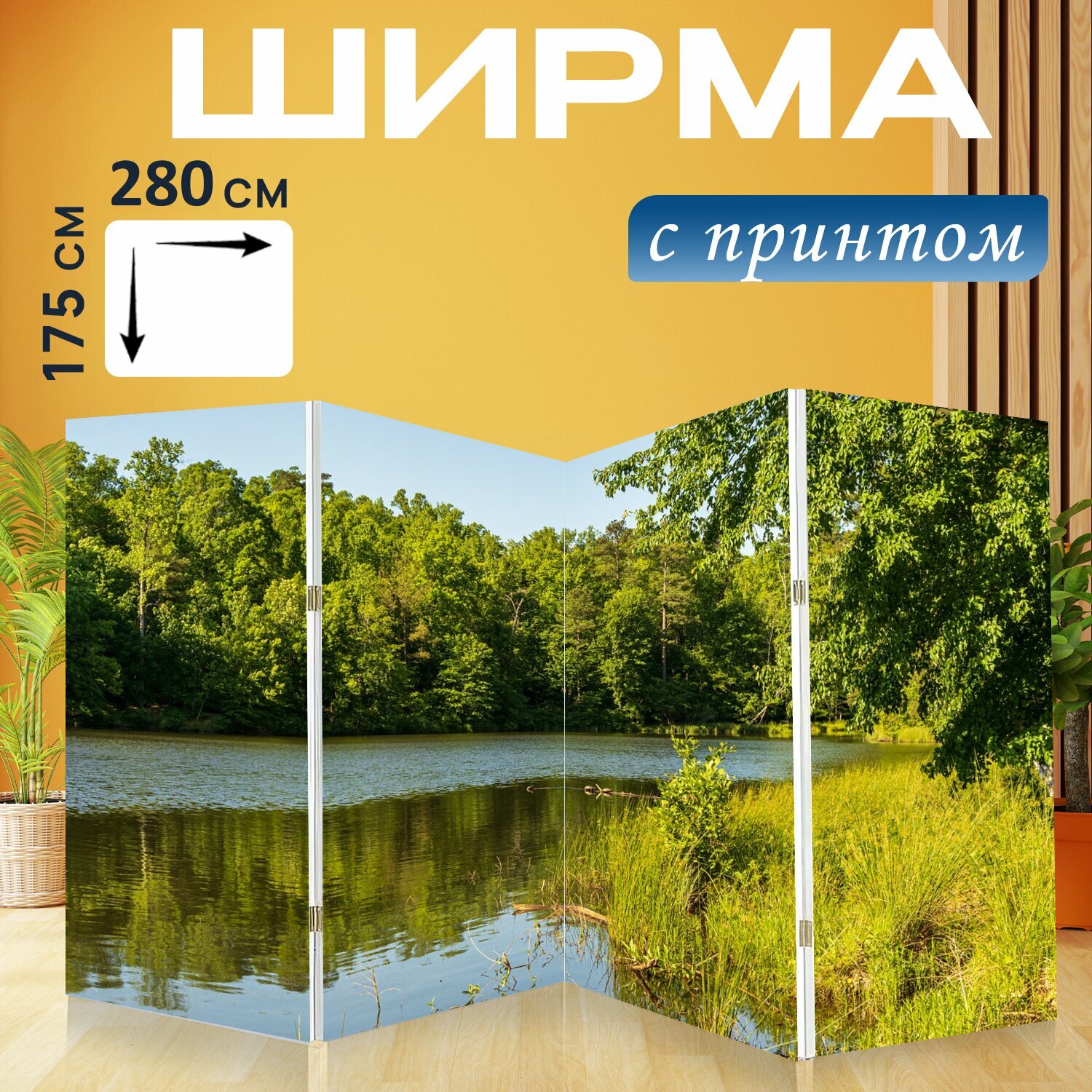 Ширма "Сохранить озеро, заповедник, озеро может" перегородка для зонирования комнаты с принтом 280x175 см. на холсте интересное: