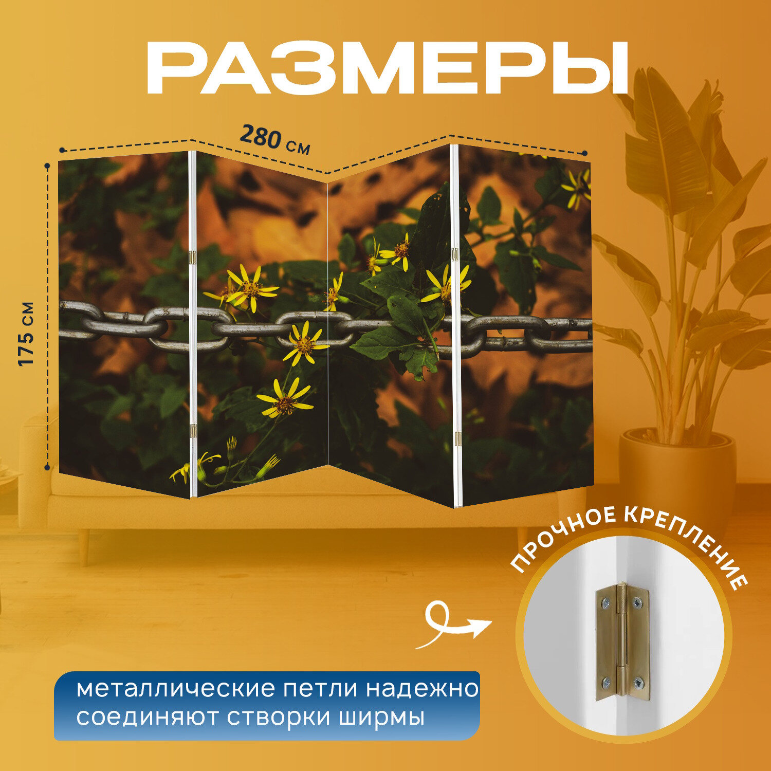 Ширма "Цепь, цветы, завод" перегородка для зонирования комнаты с принтом 280x175 см. на холсте интересное: