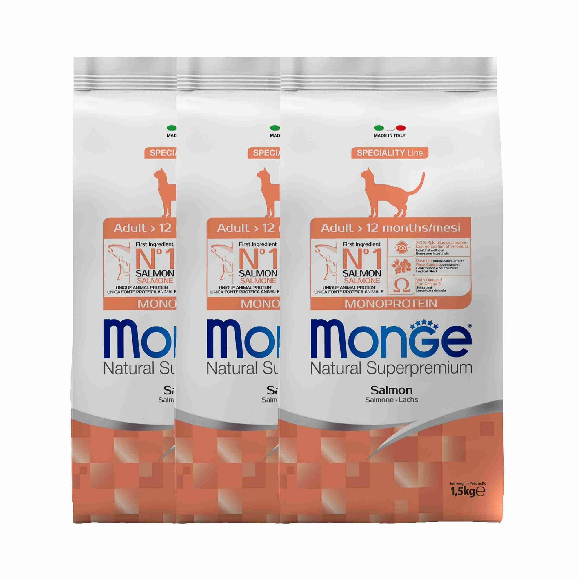 Купить Monge Cat Monoprotein корм для взрослых кошек с лососем 1,5 кг х 3 шт.