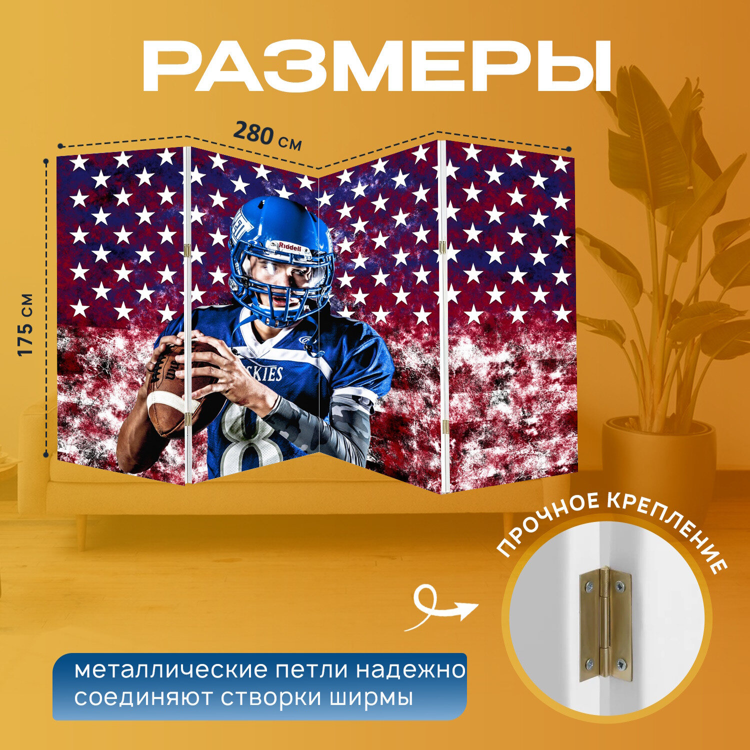 Ширма "Соединенные штаты америки, американский футбол, виды спорта" перегородка для зонирования комнаты с принтом 280x175 см. на холсте интересное: