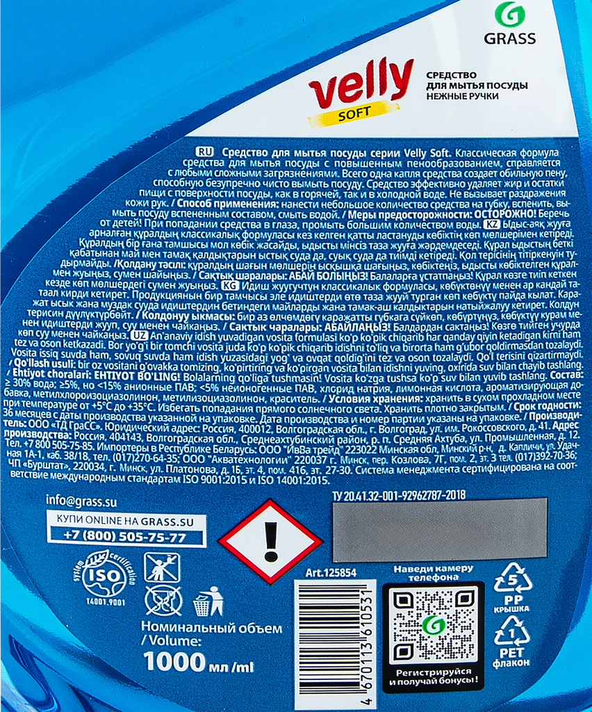 125427_средство Для Мытья Посуды! 'Velly' Лимон 1000мл GraSS арт. 125427