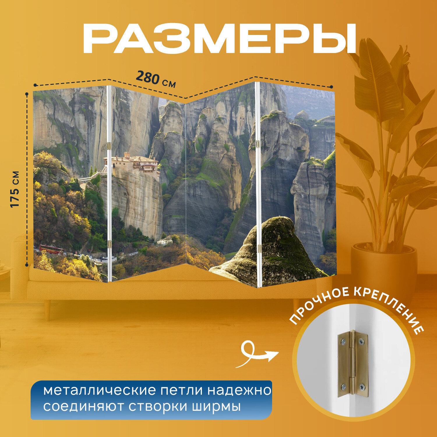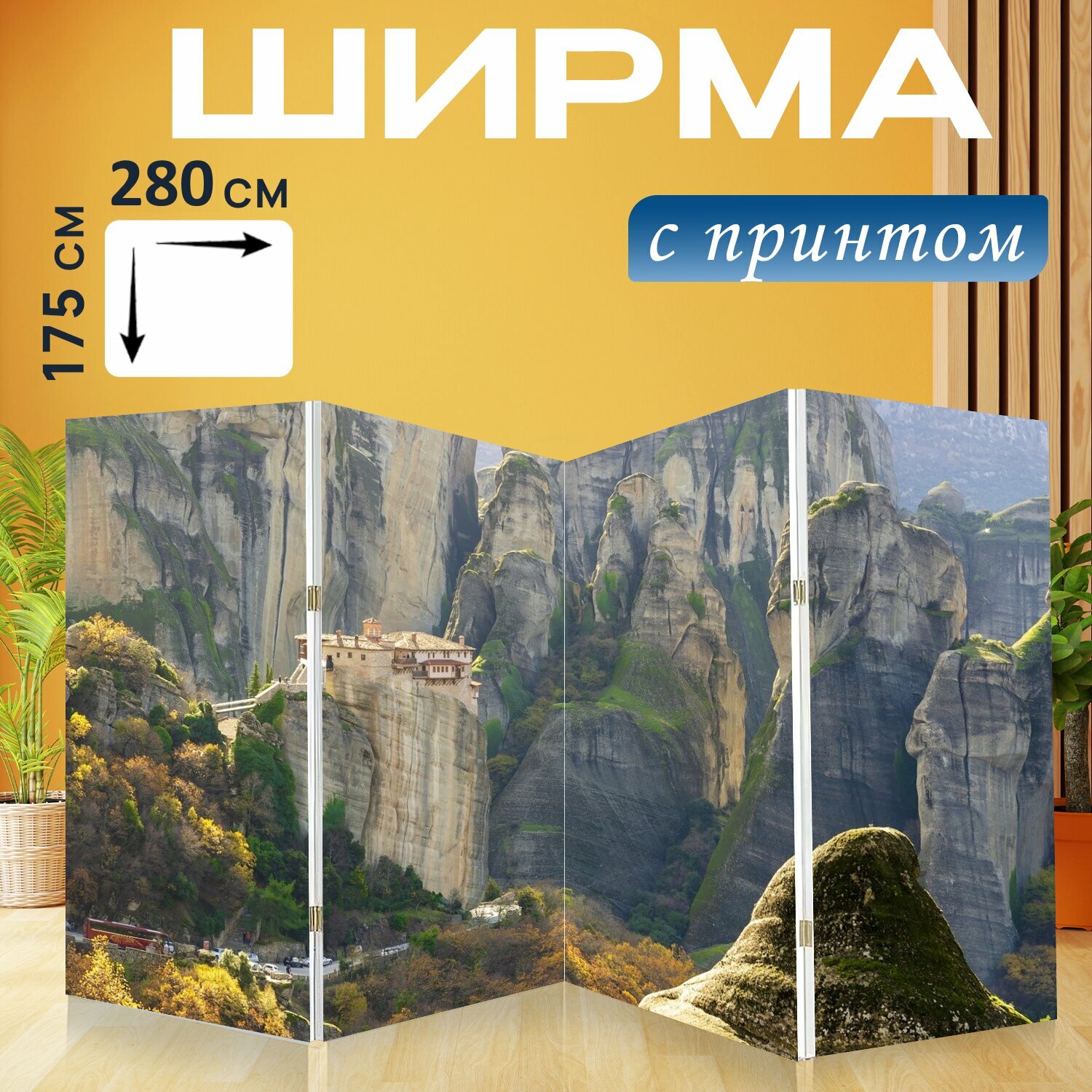 Ширма "Метеора, греция, монастырь" перегородка для зонирования комнаты с принтом 280x175 см. на холсте интересное: