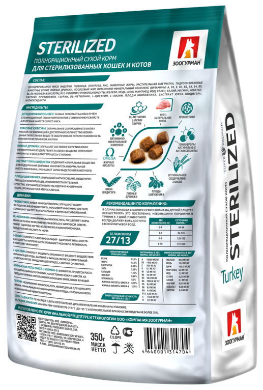 Zoogurman Sterilized, Индейка/Turkey сухой корм для стерилизованных кошек и котов, 350 гр.