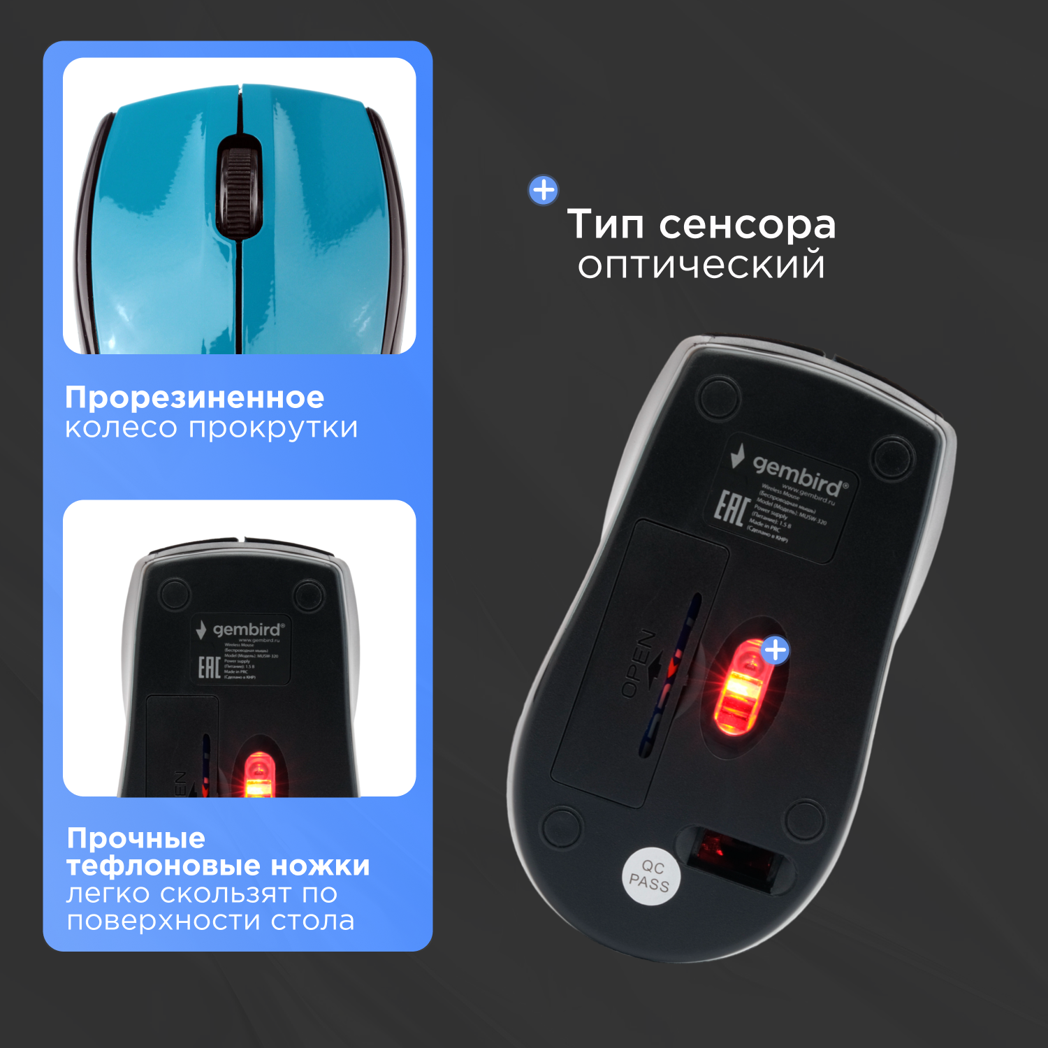 Мышь беспроводная Gembird MUSW-320-B, 2.4 ГГц, голубой, 2 кнопки+колесо-кнопка, 1000 DPI, батарейки в комплекте