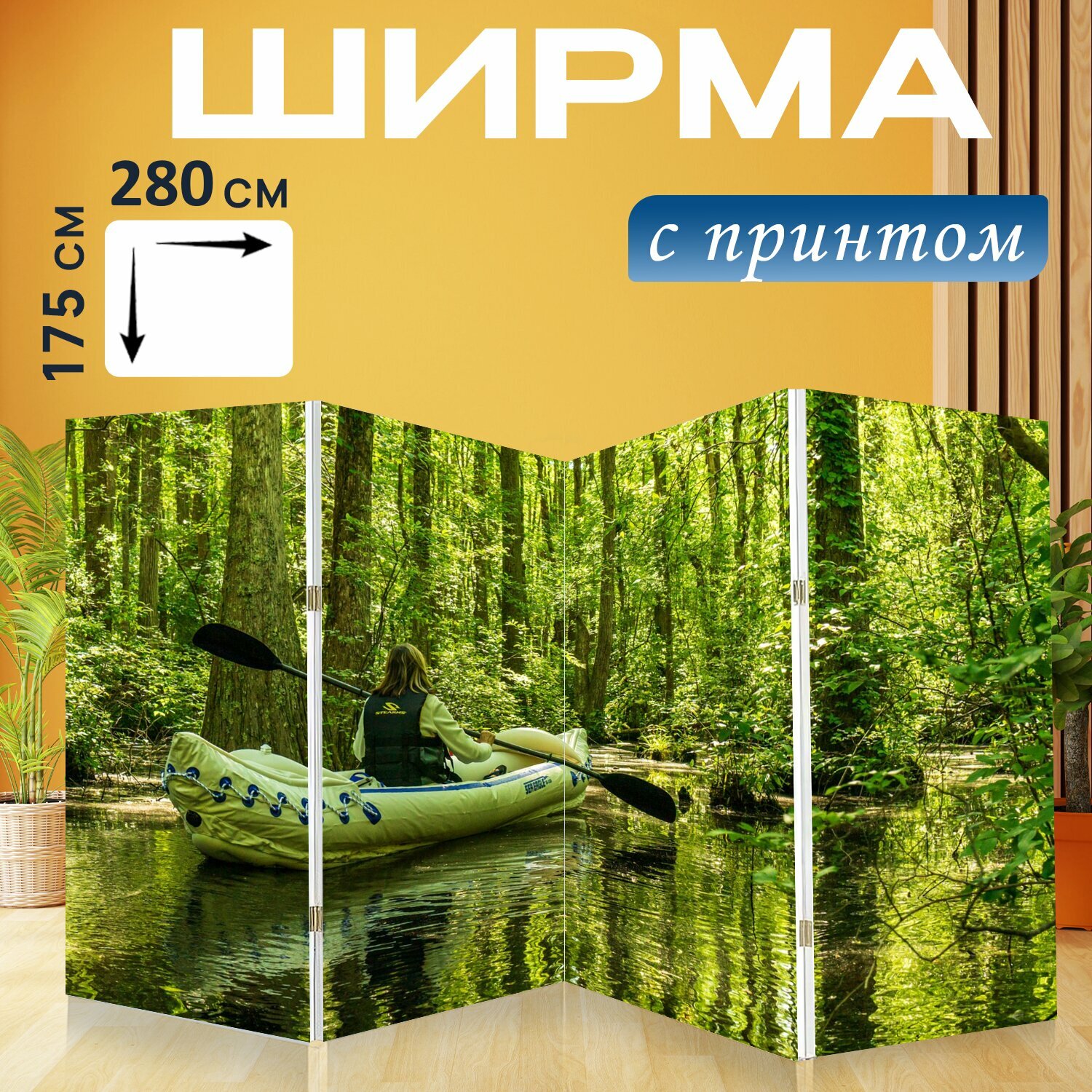 Ширма "Каяк след, кипарис пруд, сайпресс болото" перегородка для зонирования комнаты с принтом 280x175 см. на холсте интересное: