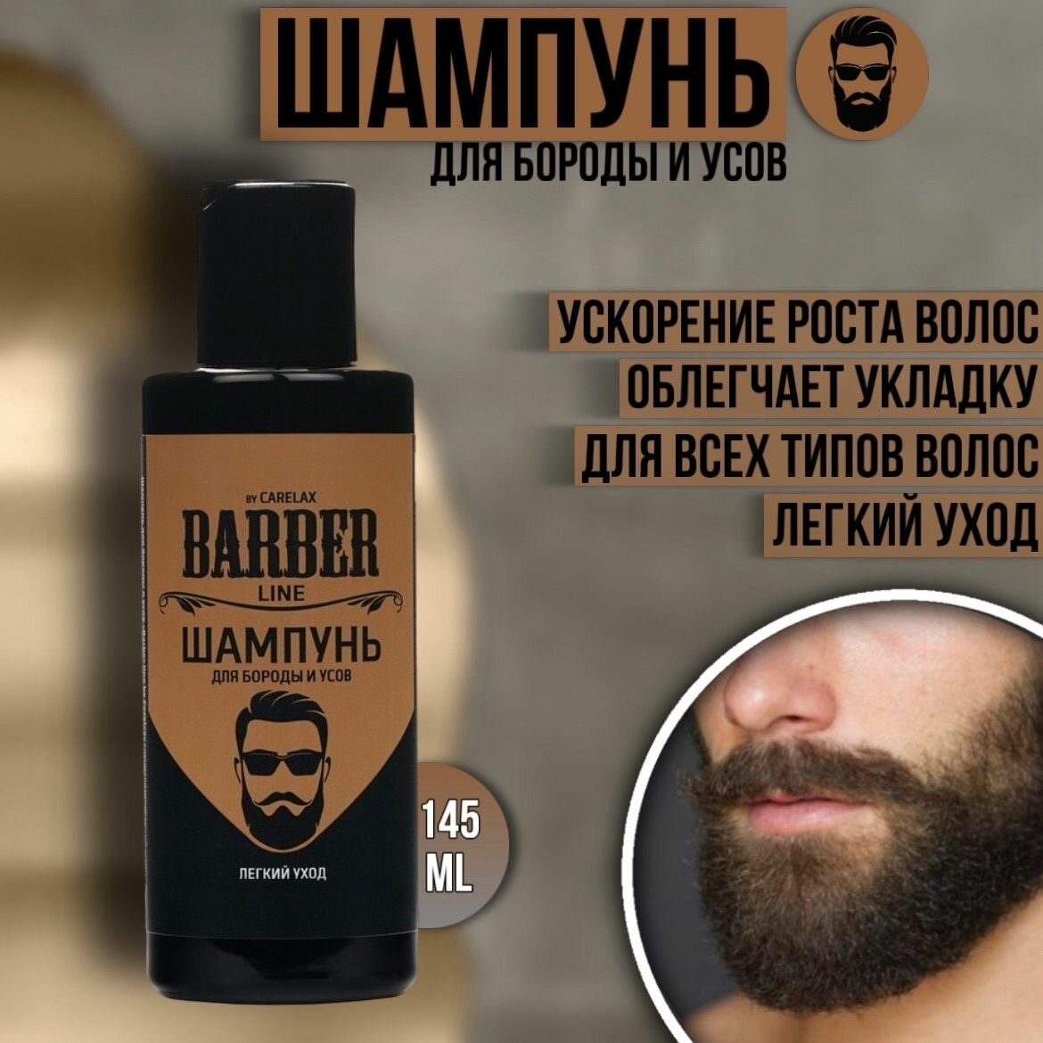 Шампунь для бороды, усов и головы Carelax Barber Line, 145 мл.