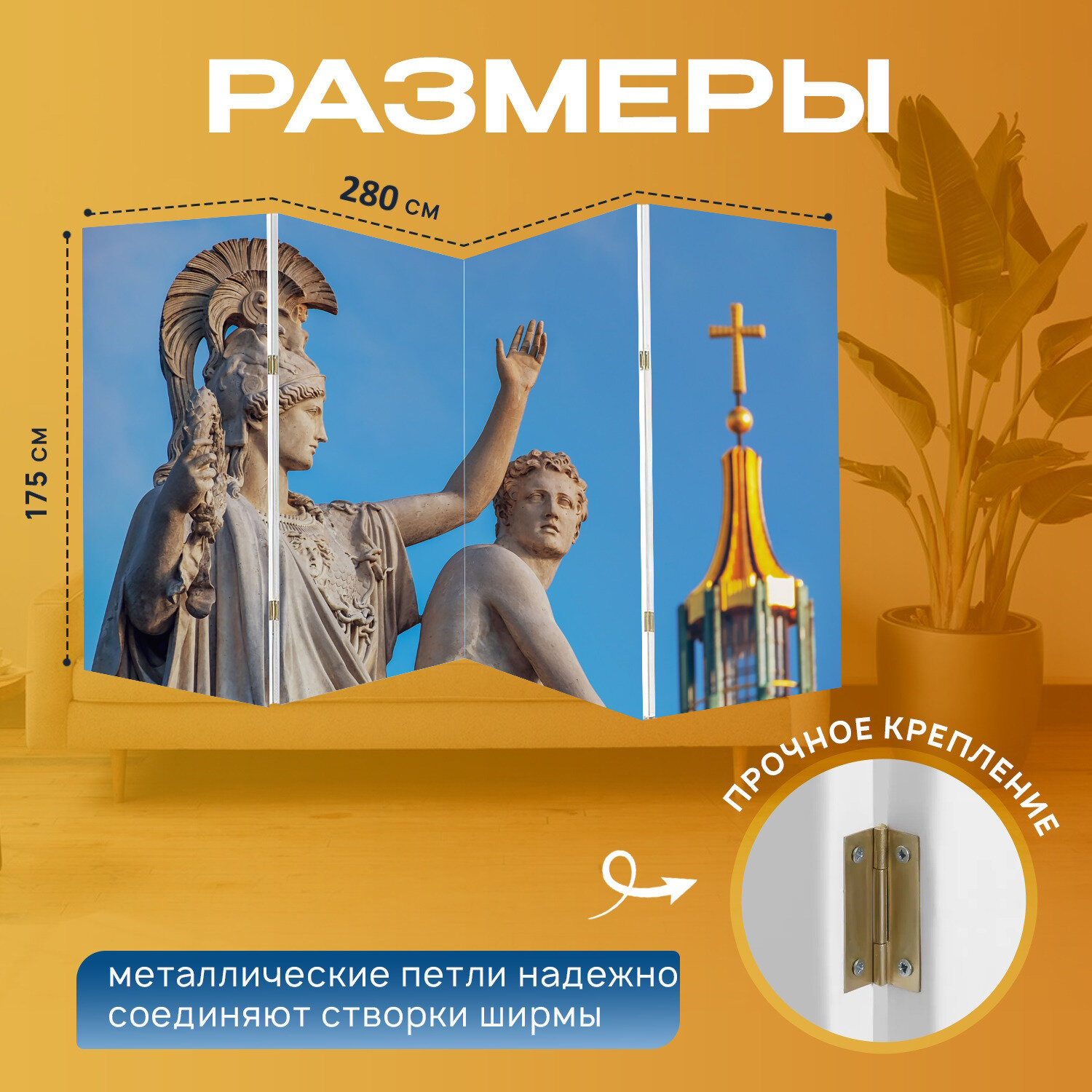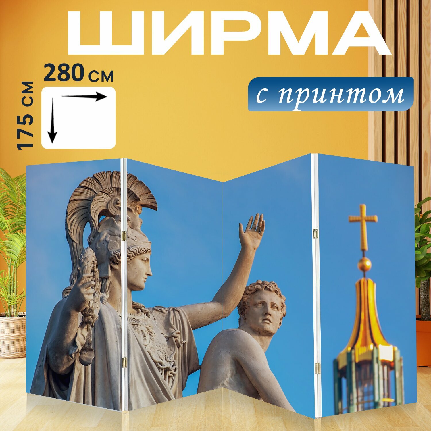 Ширма "Памятник, скульптура, греческие боги цифры" перегородка для зонирования комнаты с принтом 280x175 см. на холсте интересное: