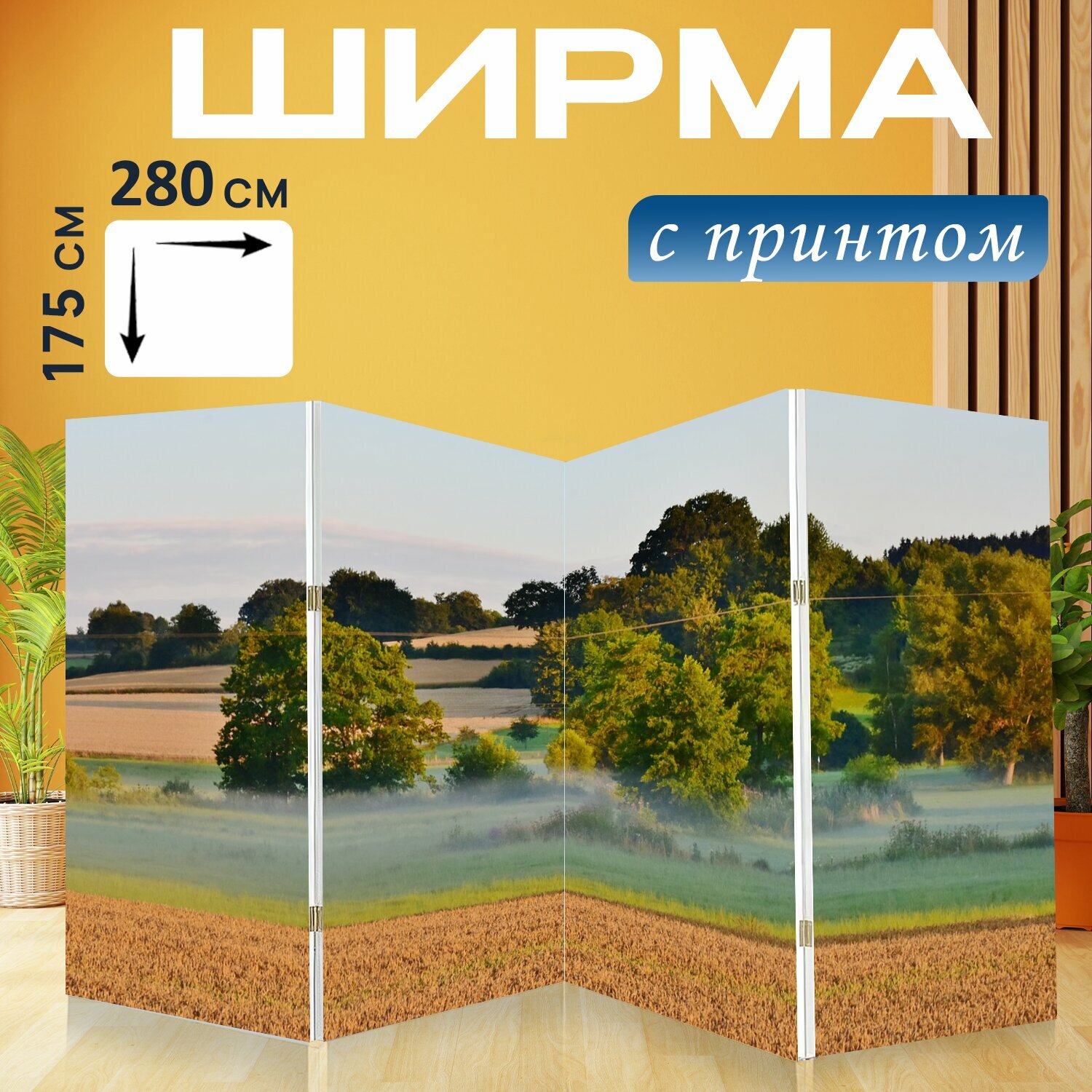 Ширма "Пейзаж, утром, рано" перегородка для зонирования комнаты с принтом 280x175 см. на холсте интересное: