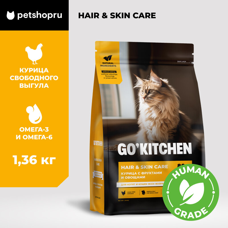 Купить GO'KITCHEN сухой корм для котят и кошек всех возрастов со свежей курицей, фруктами и овощами, HAIR+SKIN CARE Chicken 1,36 кг