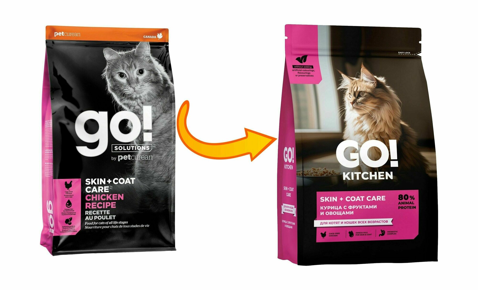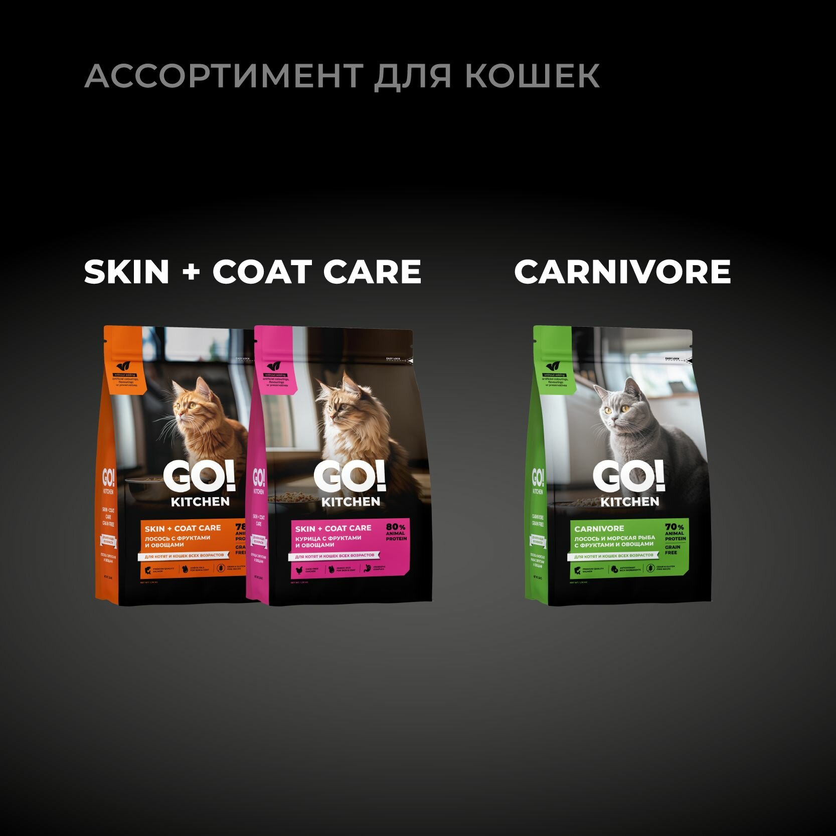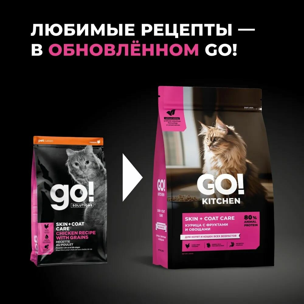 СохранитьGO'KITCHEN сухой корм для котят и кошек всех возрастов со свежей курицей, фруктами и овощами, HAIR+SKIN CARE Chicken 1,36 кг интересное:
