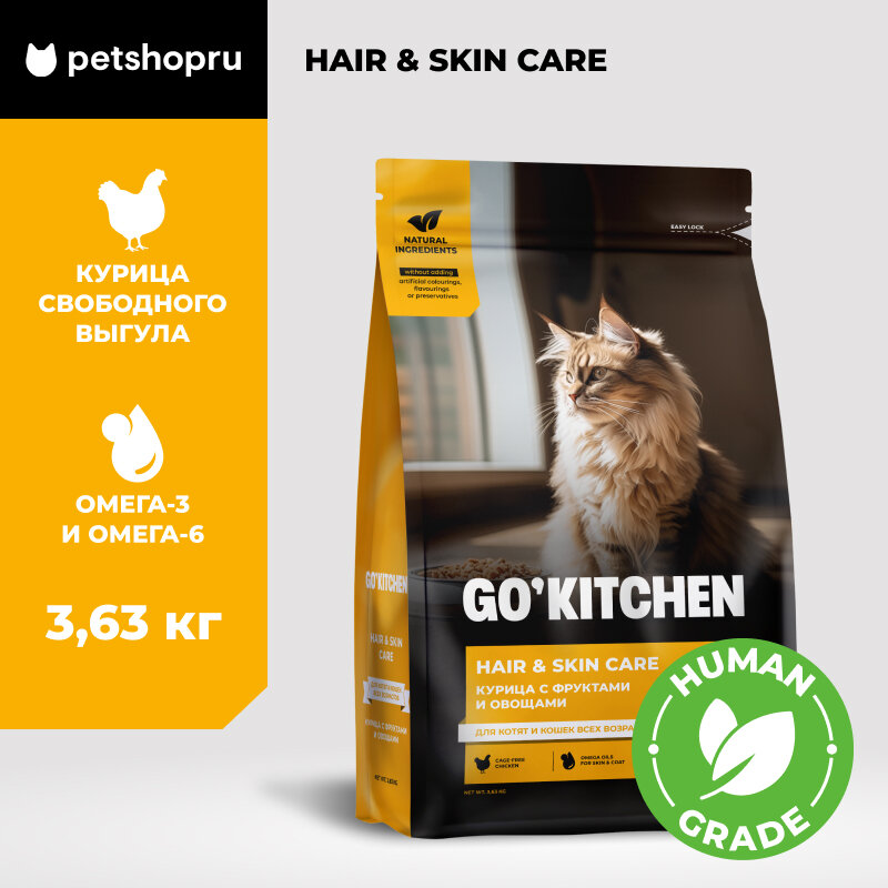 Купить GO'KITCHEN сухой корм для котят и кошек всех возрастов со свежей курицей, фруктами и овощами, HAIR+SKIN CARE Chicken 3,63 кг