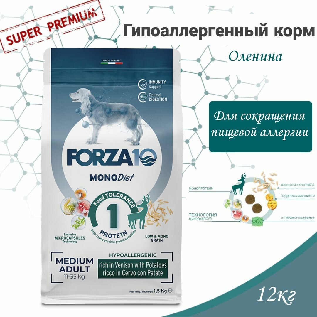 Сухой корм для собак Forza10 Diet Medium при чувствительном пищеварении, гипоаллергенный, оленина с картофелем 1 уп. х 1 шт. х 12 кг (для средних пород)