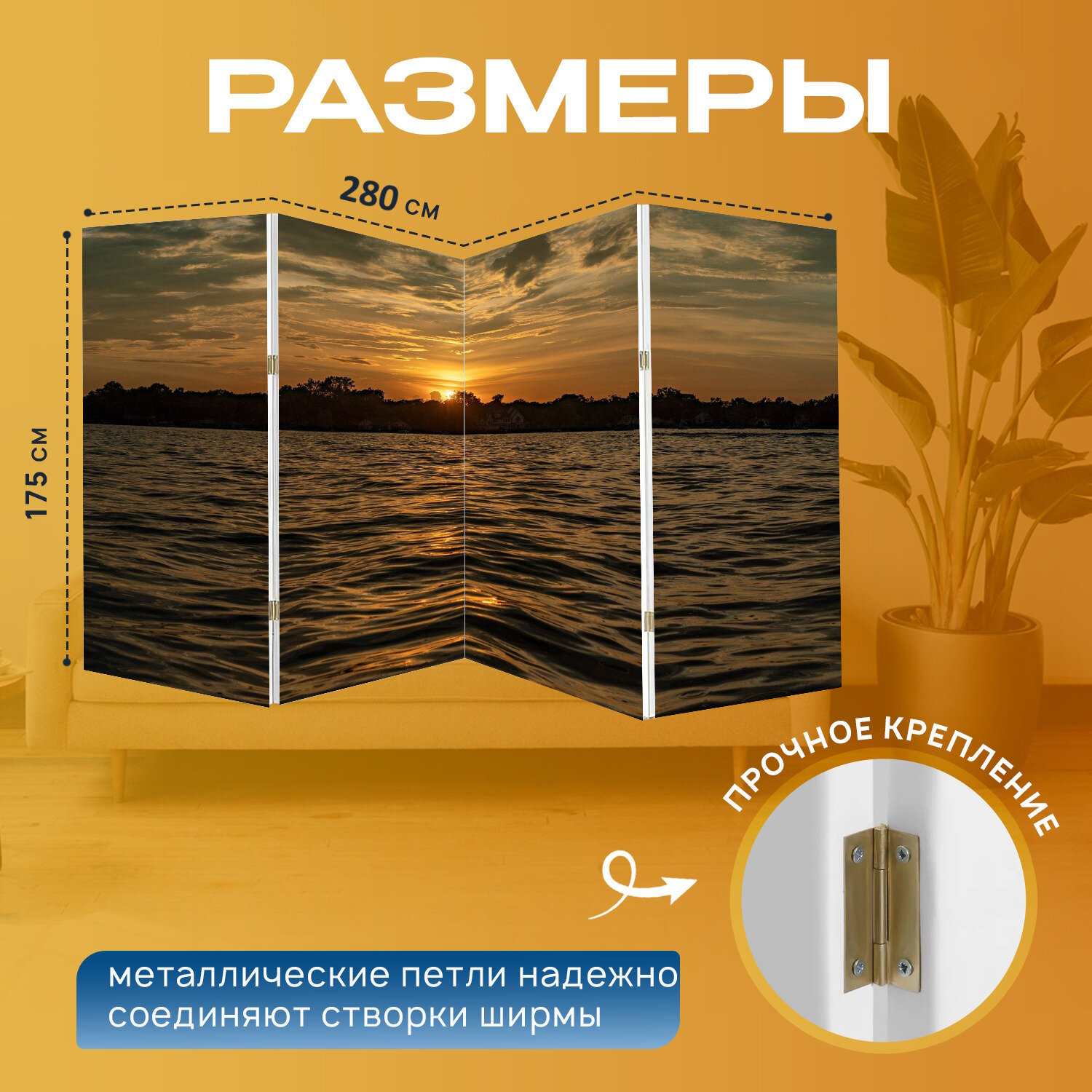 Ширма "Заход солнца, озеро, вода" перегородка для зонирования комнаты с принтом 280x175 см. на холсте интересное: