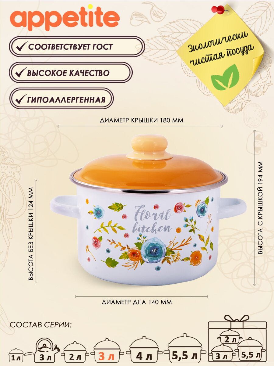 Купить Кастрюля эмалированная с крышкой Floral kitchen 3 л ТМ Appetite