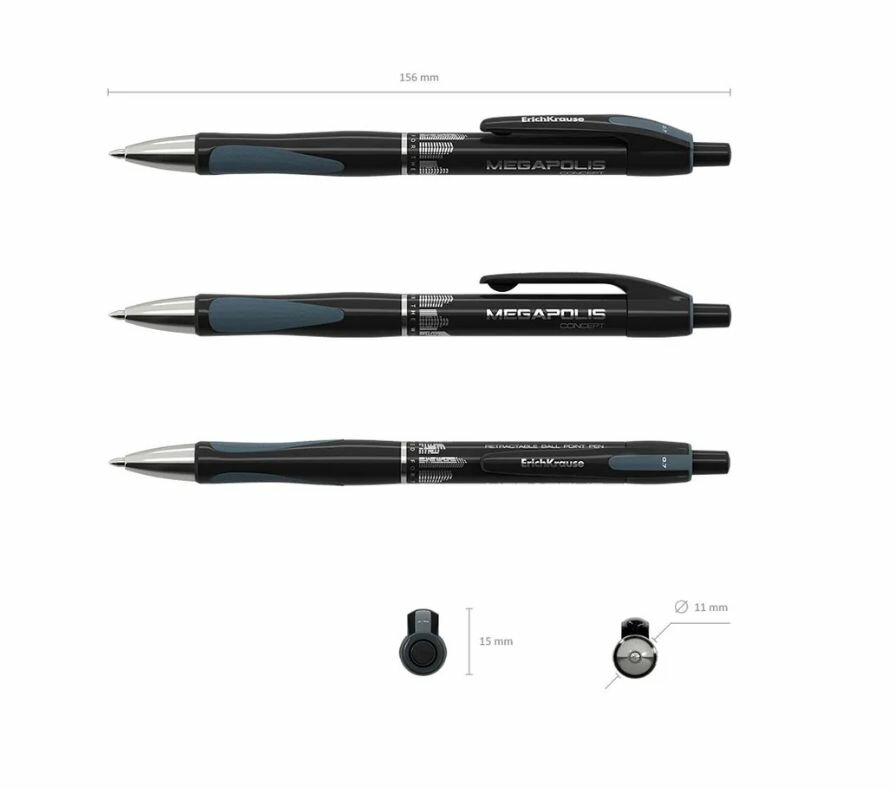 Квант продажи 3 шт. Ручка шариковая автоматическая ERICH KRAUSE «Megapolis Concept», черная, корпус черный, узел 0,7 мм, линия письма 0,35 мм, 32