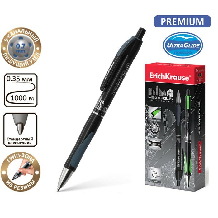 Набор 12 штук - Ручка шариковая автоматическая ERICH KRAUSE "Megapolis Concept", черная, корпус черный, узел 0,7 мм, линия письма 0,35 мм