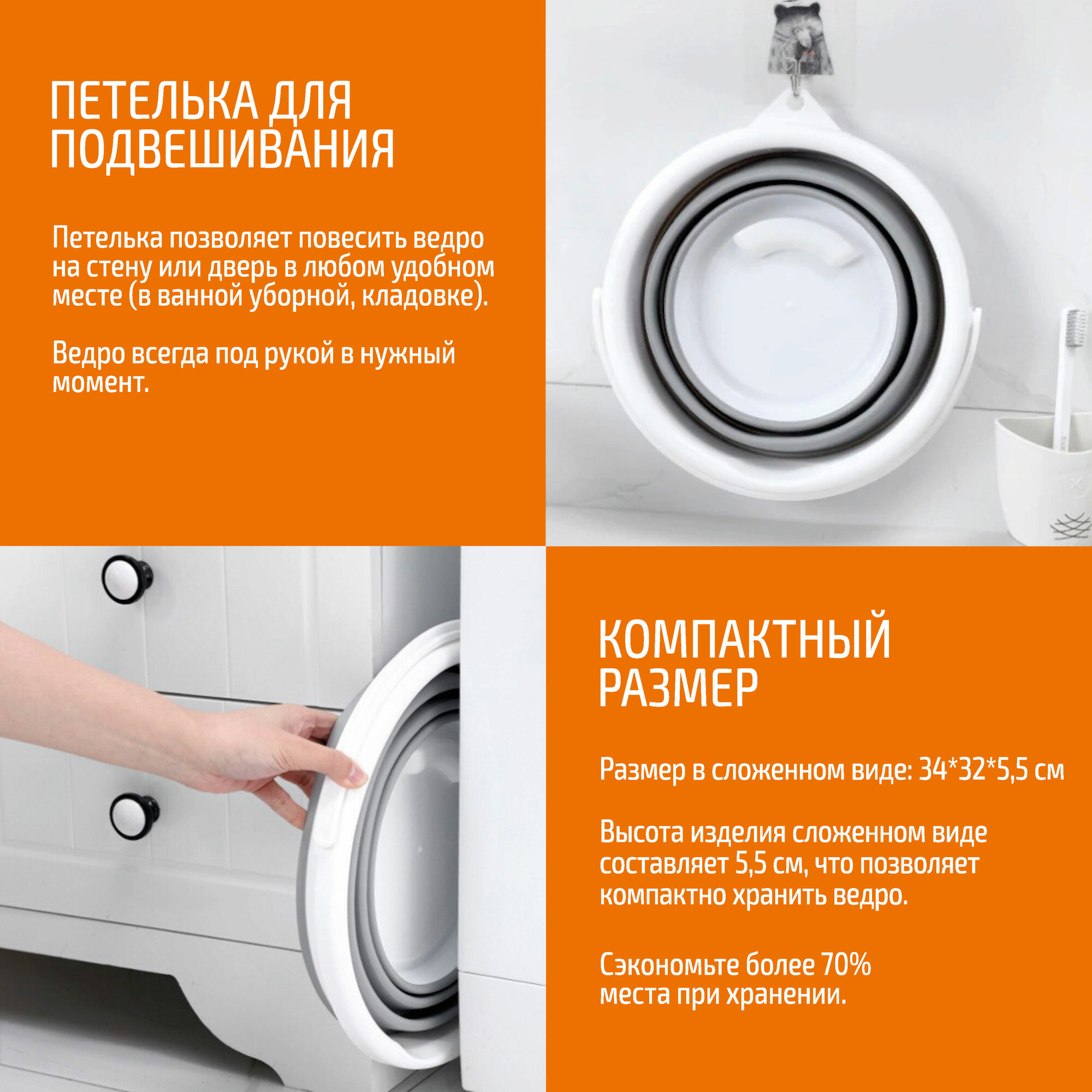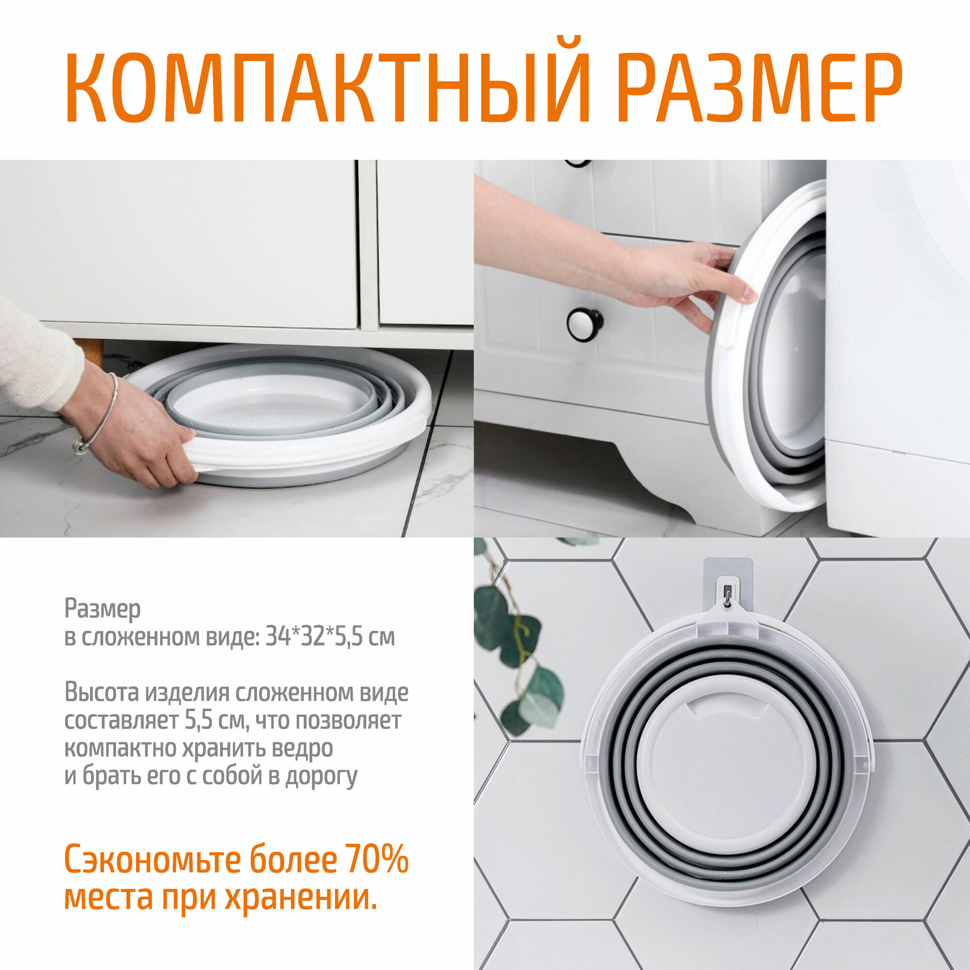 Компактное складное ведро силиконовое на 10 литров круглое Размер: 37,5 х 37,5 х 6 см