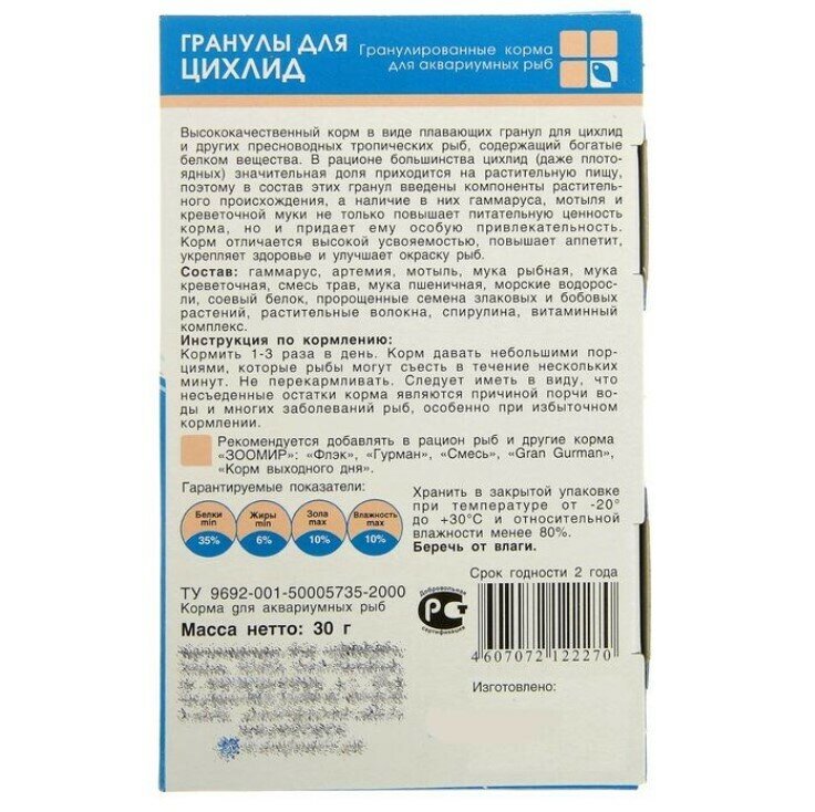 Корм для рыб "зоомир Гранулы для цихлид" плавающие гранулы, коробка, 30 г (2 шт)