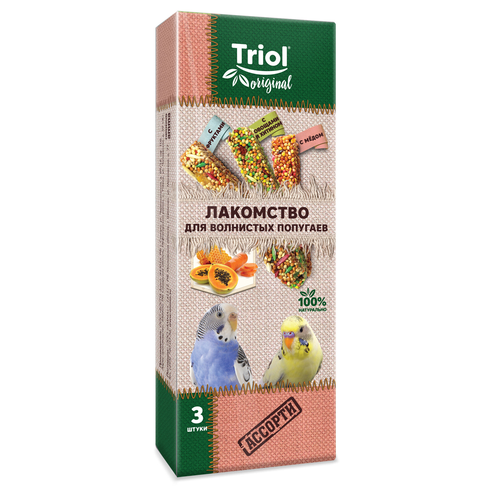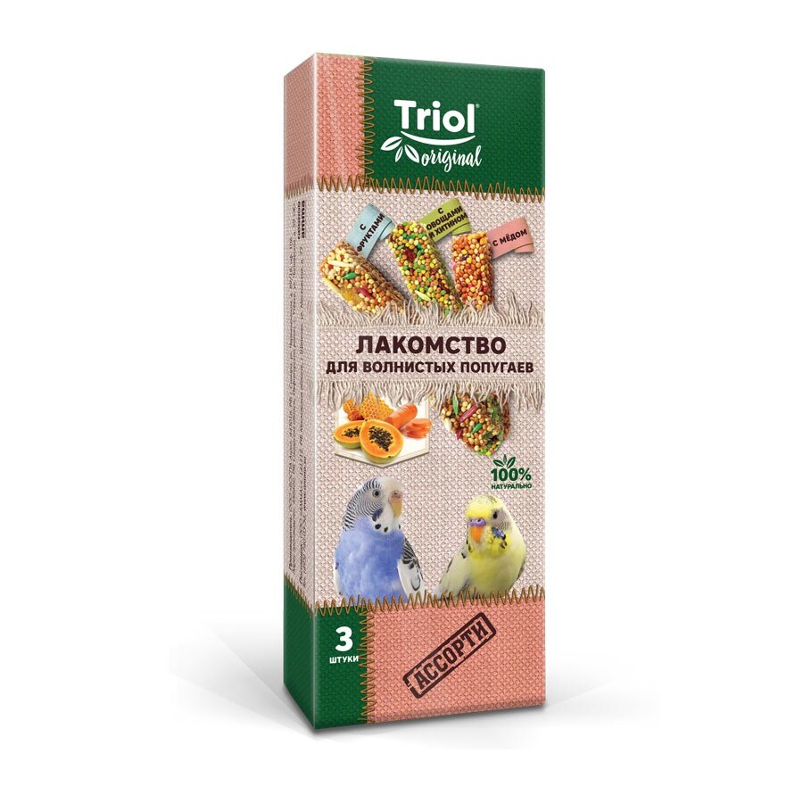 TRIOL™ Лакомство для волнистых попугаев ассорти (с фруктами, с овощами и хитином, с мёдом) Original