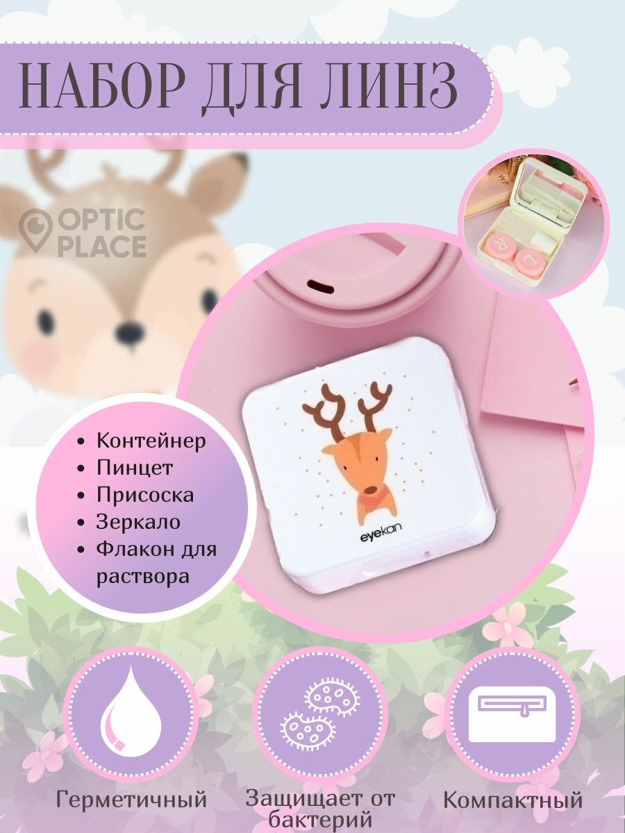 Контейнер для контактных линз Eyekan с зеркалом, пинцетом, присоской и флаконом для раствора "Animals Животные", олень интересное:
