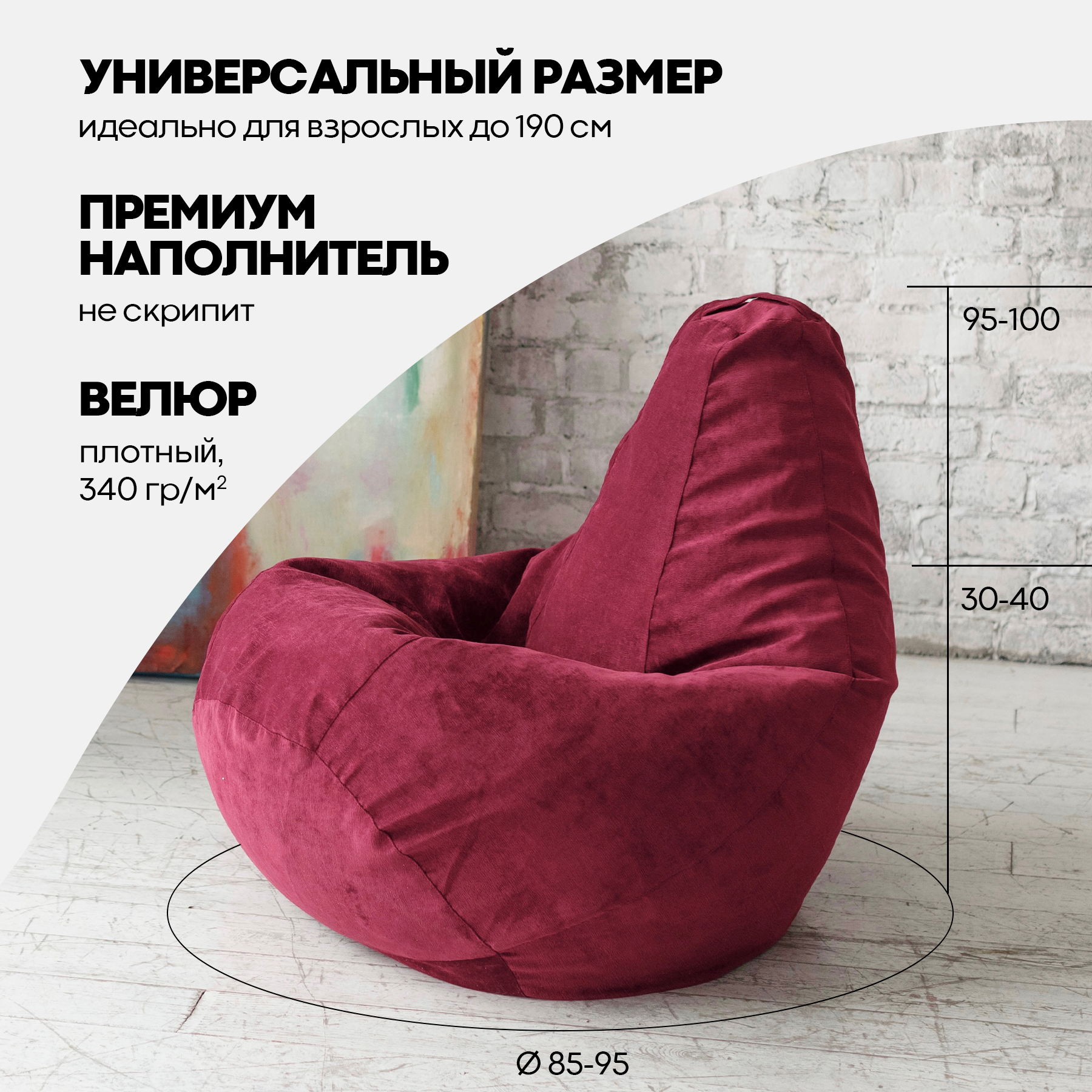 Купить Кресло Мешок Груша Бордовый Велюр (3XL, Классический)