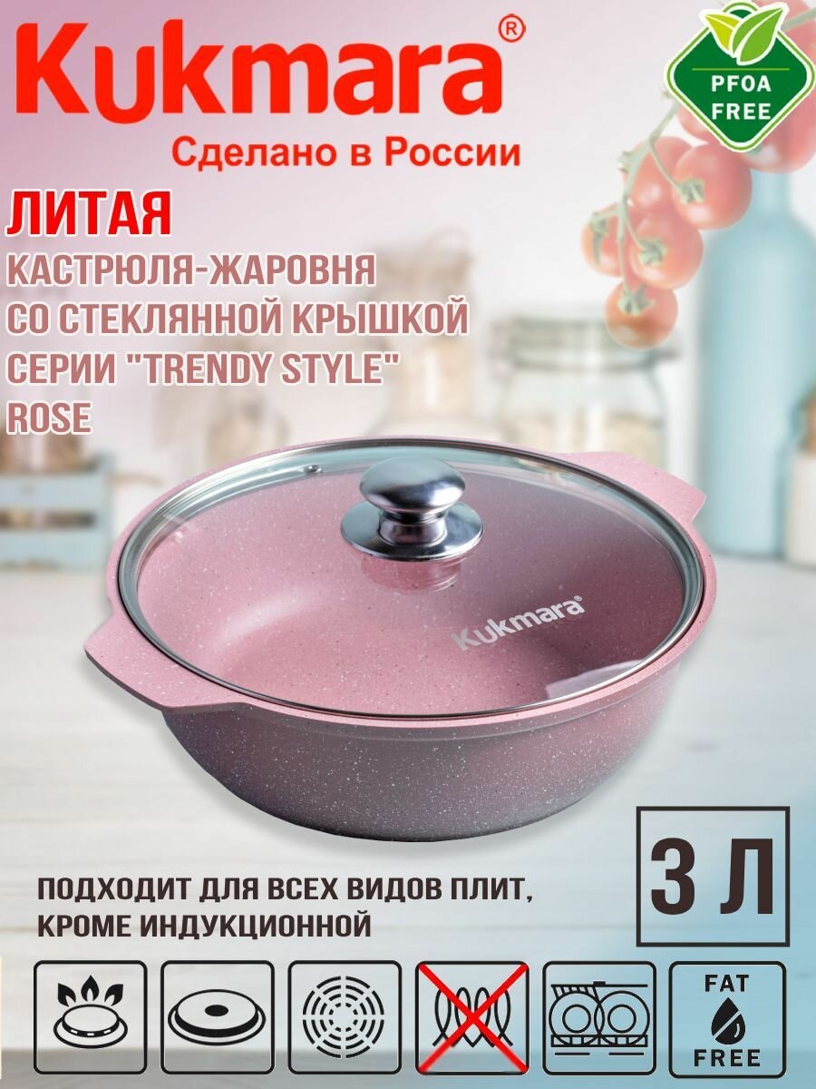 Купить Кастрюля-жаровня 3л Kukmara Кукмара стеклянная крышка Антипригарное покрытие Trendy style цвет rose ж31tsr