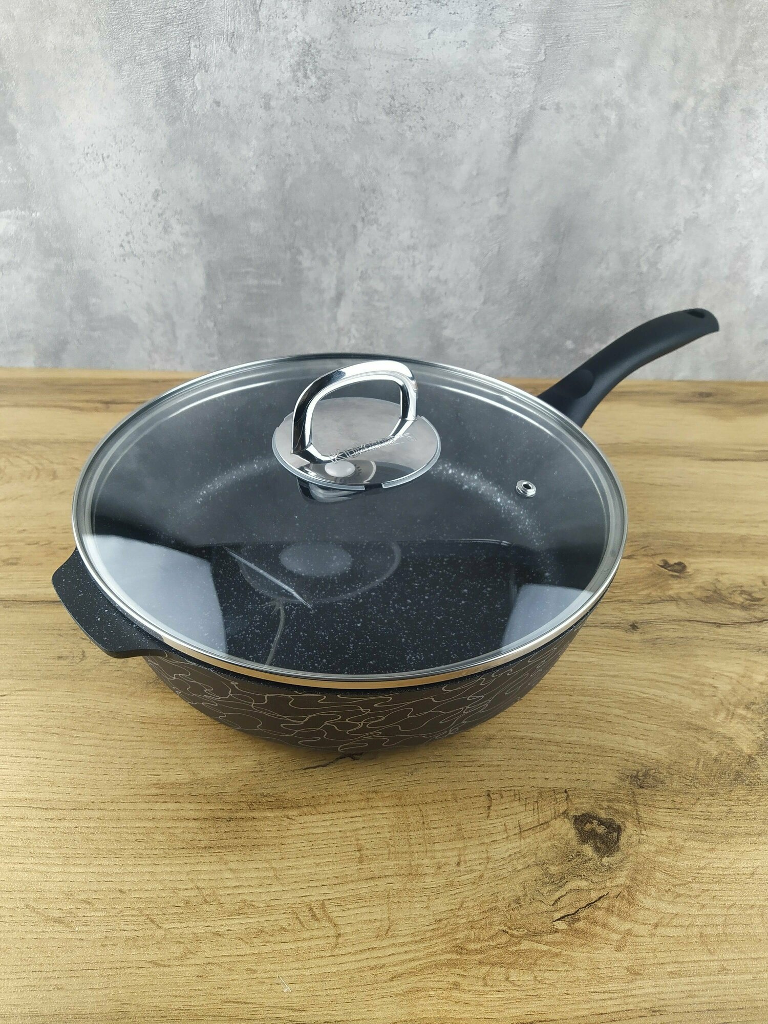 Сковорода 280/65мм с ручкой,стеклянной крышкой,антипригарное покрытие(кофейный мрамор) смк284а