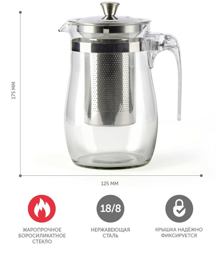 Чайник заварочный Barouge, стекло, для чая и кофе, с фильтром, объем: 1.5 л