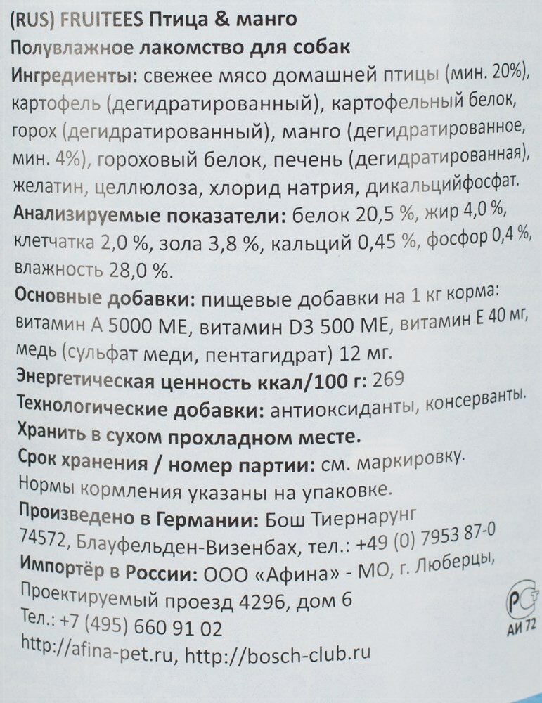 Ниже Вы можете прочитать отзывы на Лакомство для собак Bosch Fruitees fresh Poultry & Mango (Фруттис птица с манго) 200 гр, ознакомится с подробными характеристиками, посмотреть интересные обзоры и фотографии на Лакомство для собак Bosch Fruitees fresh Poultry & Mango (Фруттис птица с манго) 200 гр.