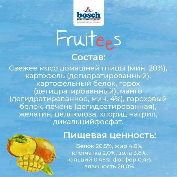 Лакомство для собак Bosch Fruitees fresh Poultry & Mango (Фруттис птица с манго) 200 гр интересное: