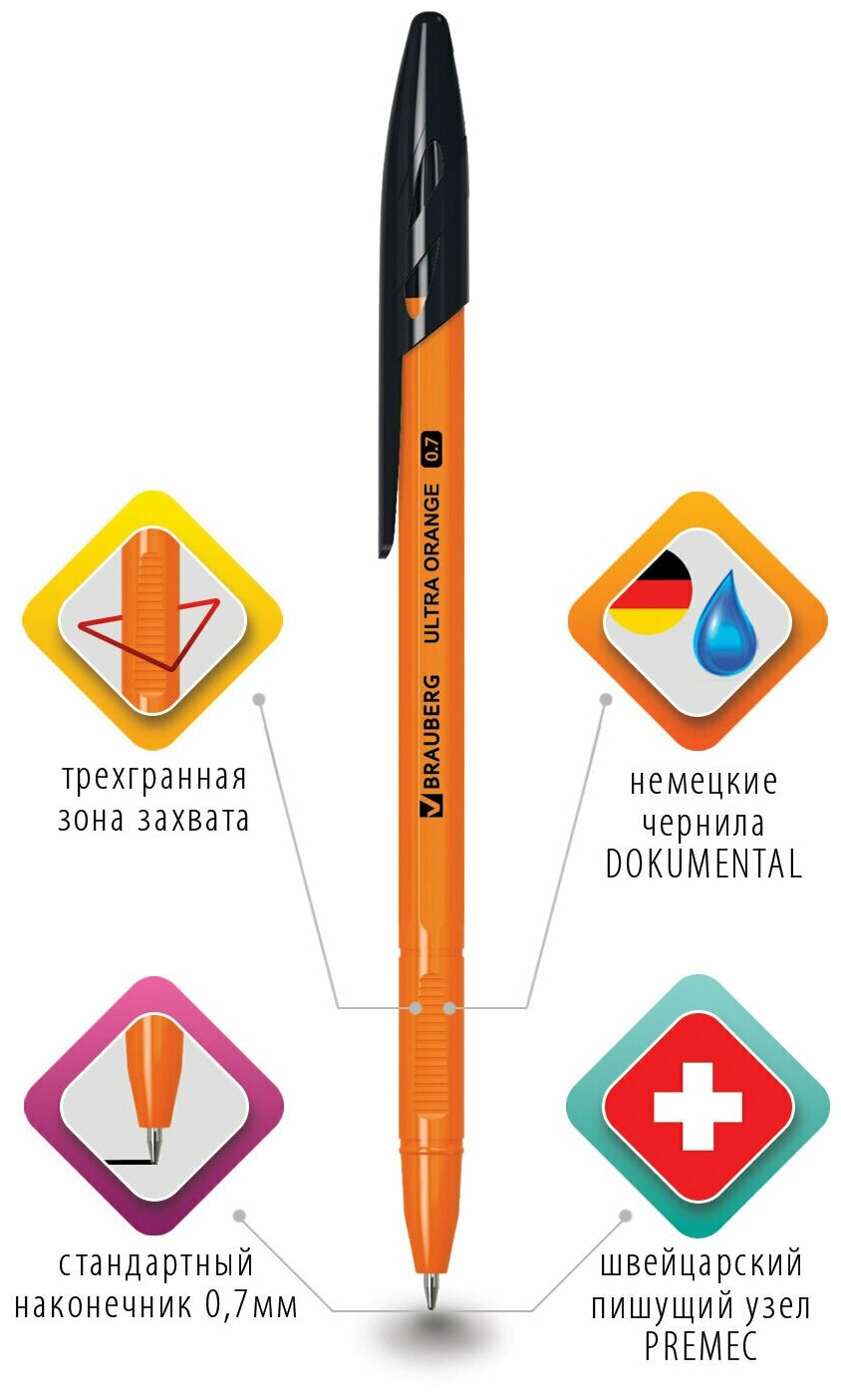 Купить Ручка шариковая BRAUBERG "ULTRA ORANGE" черная узел 0 7 мм чернила германия наконечник швейцария, 50 шт