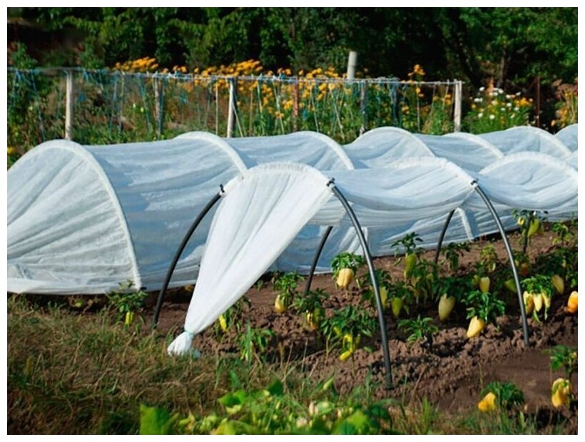 Укрывной материал спанбонд, плотность 17, размеры 1,6x10м, используется для мульчирования, защищает от вредителей и сорняков. Подходит для овощей, ягодных кустарников.