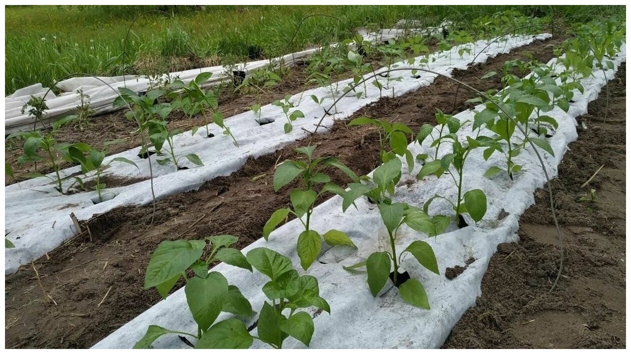 Укрывной материал спанбонд, плотность 17, размеры 1,6x10м, используется для мульчирования, защищает от вредителей и сорняков. Подходит для овощей, ягодных кустарников.