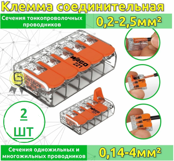 СохранитьКлемма 5-и проводная Wago 221-415, в комплекте 2 шт интересное:
