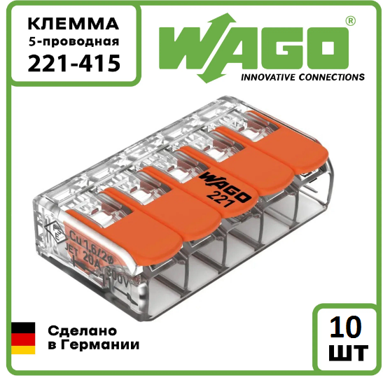 Купить Клемма 5-и проводная Wago 221-415, в комплекте 10 шт