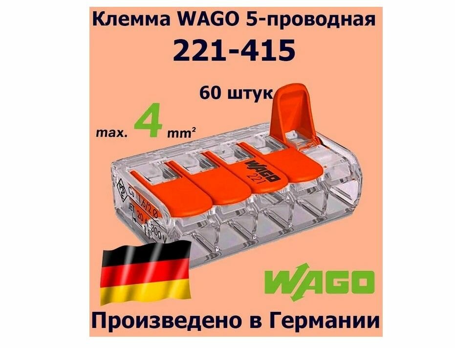 Клемма пятипроводная WAGO от 0.2-4 кв мм 32А 221-415 Германия