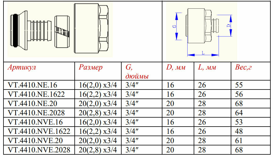 Евроконус Valtec VT.4410 для пластиковой трубы фитинг обжимной латунный 20 (2,8) 3/4" арт. VT.4410.NE.2028