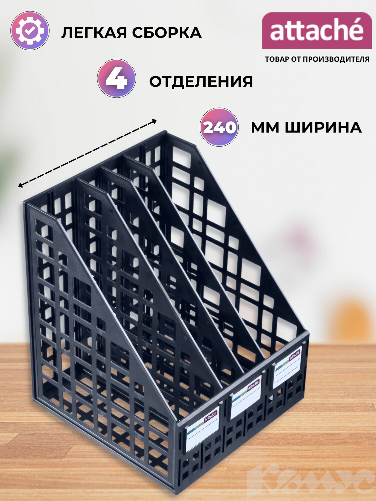 Лоток для бумаг Attache сборный, вертикальный, 4 отделения, 240 мм, черный