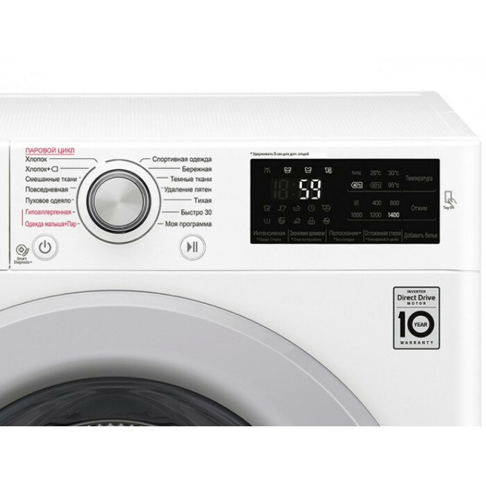 | Плюсы: | Вместительная, тихая и надёжная. Предыдущая LG прослужила 12 лет. Множество настроек. Прямой привод. Информативный дисплей. Есть возможность дозагрузки белья. |