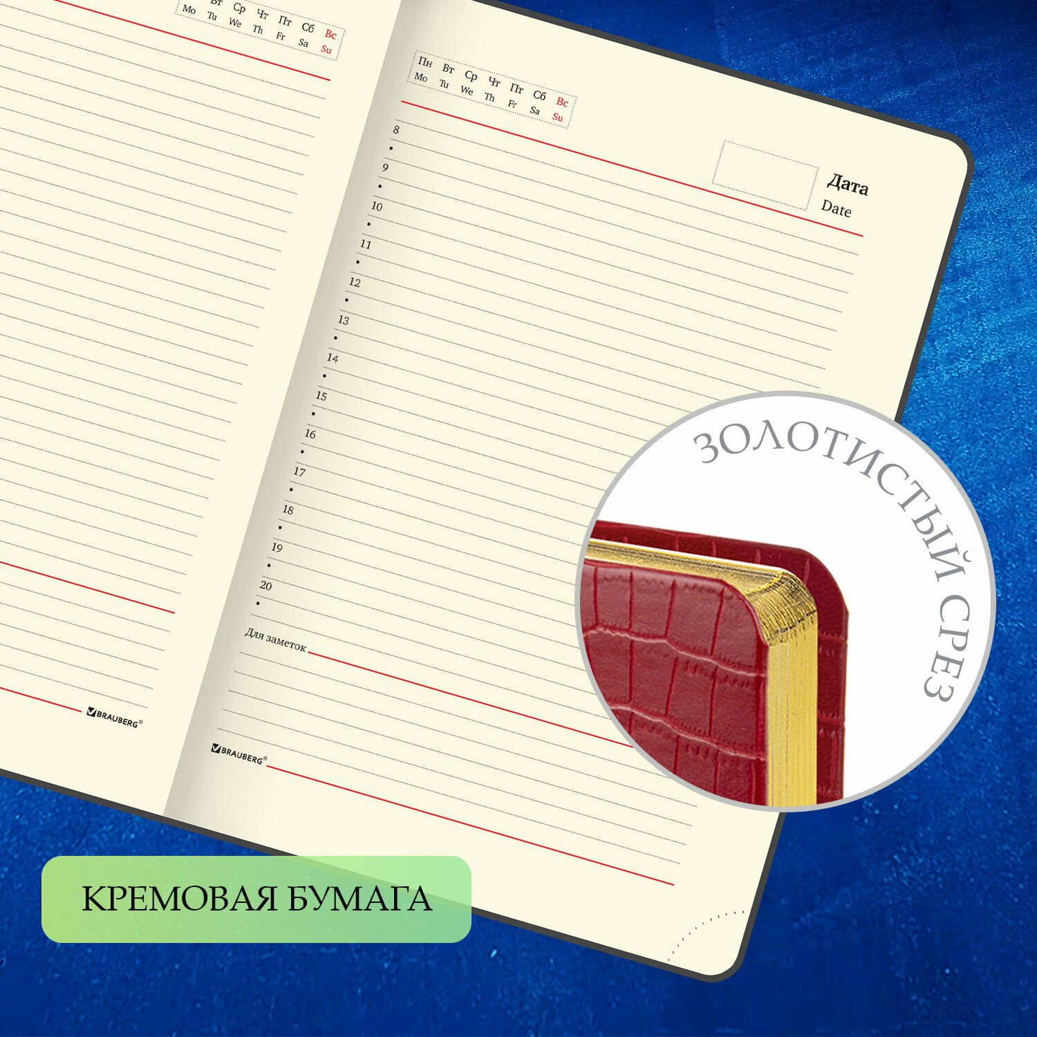 Ежедневник недатированный А5 (138х213 мм) BRAUBERG "Comodo", под матовую крокодиловую кожу, 160 л, крем. блок, зол. срез, красный, 123840
