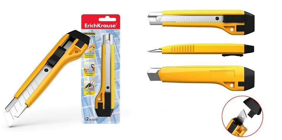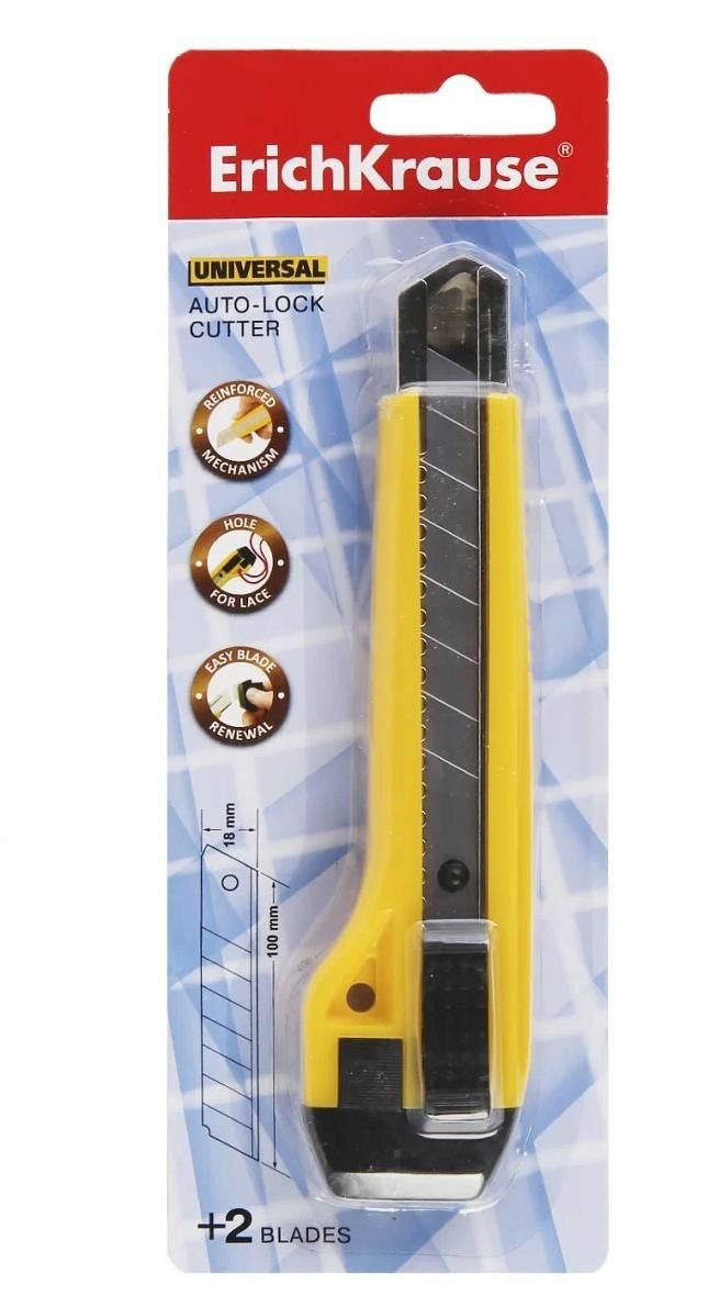 Нож канцелярский 18мм ERICH KRAUSE Universal, 2 запасных лезвия, желтый