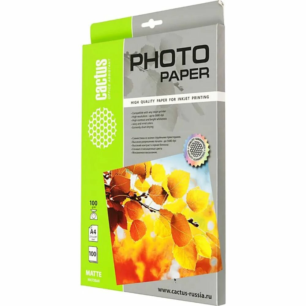 Фотобумага для струйной печати А4, 100 листов Cactus, 100 г/м2, односторонняя, матовая