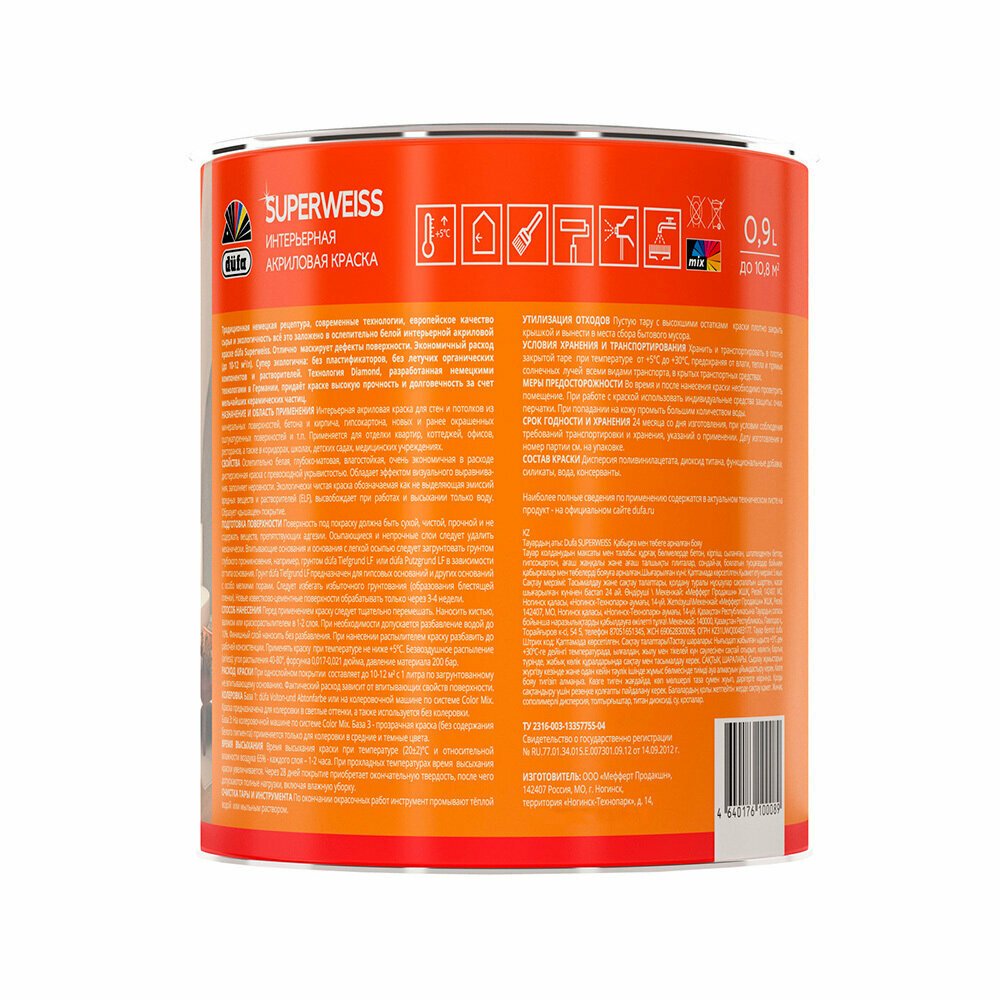 Краска Dufa SUPERWEISS RD4 ВД, белый, 0.9 л МП00-009513
