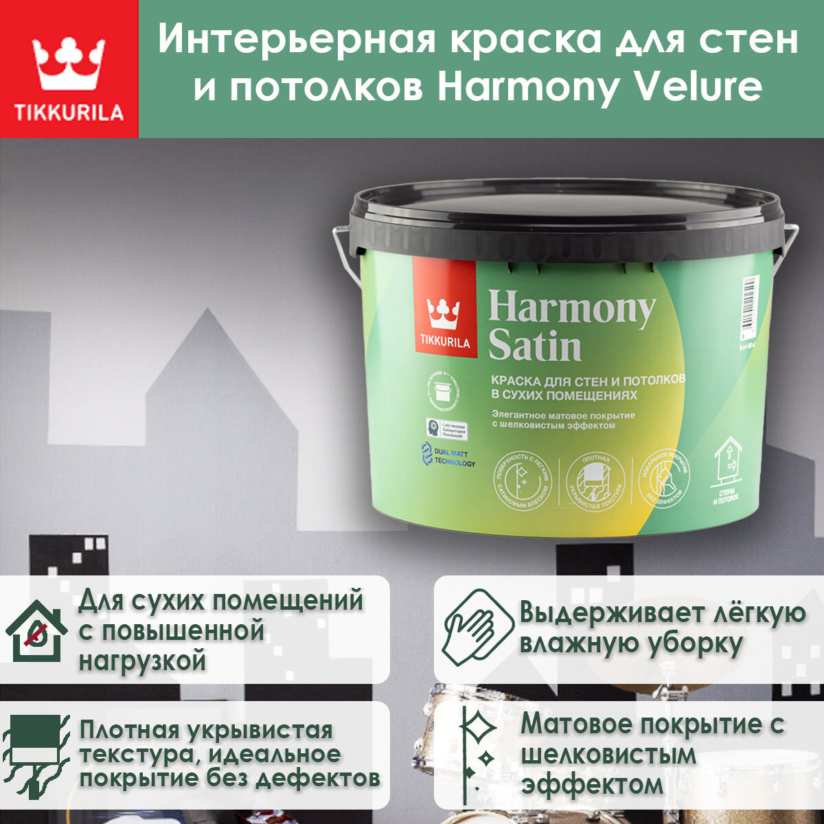 Краска TIKKURILA HARMONY SATIN для стен и потолков, матовая, база A, 2.7 л