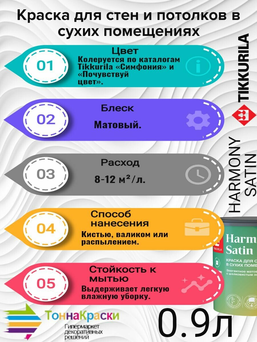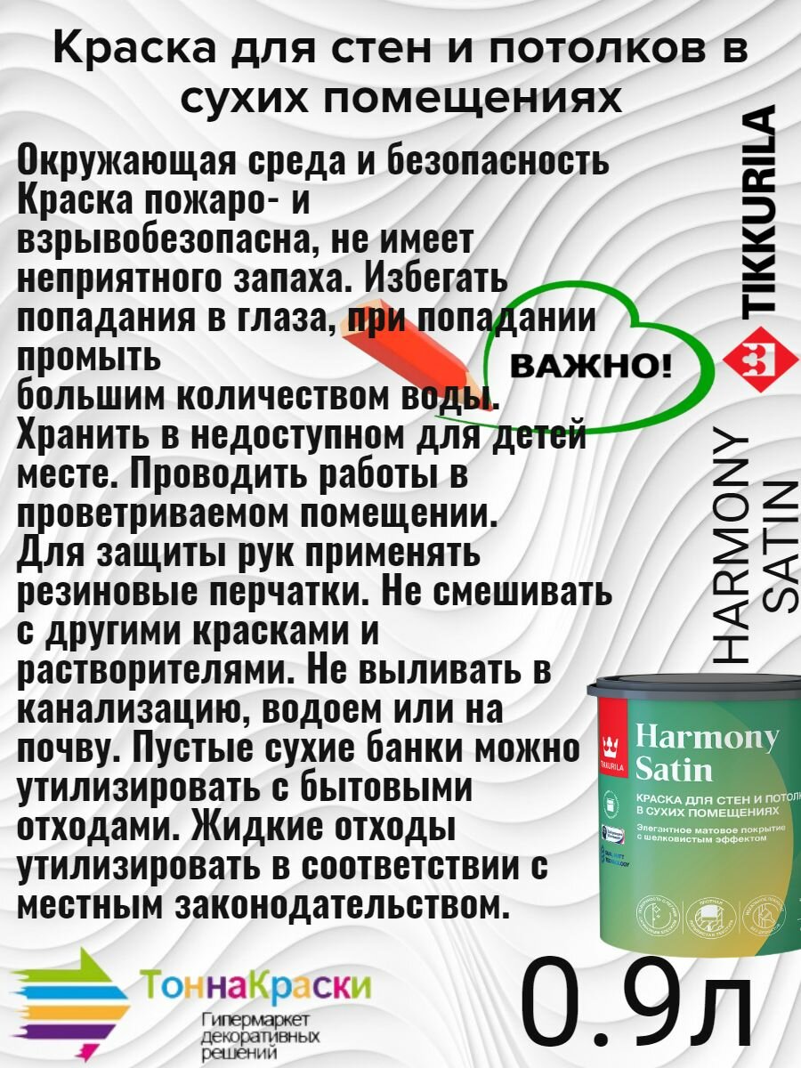 TIKKURILA Harmony Satin (Joker) краска для стен и потолков акриловая, 1 класс, матовая база А (0.9 л)